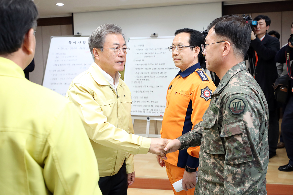 문재인 대통령이 5일 오후 강원 고성군 토성면사무소에 마련된 강원 현장상황실을 방문해 소방대원을 격려하고 있다.