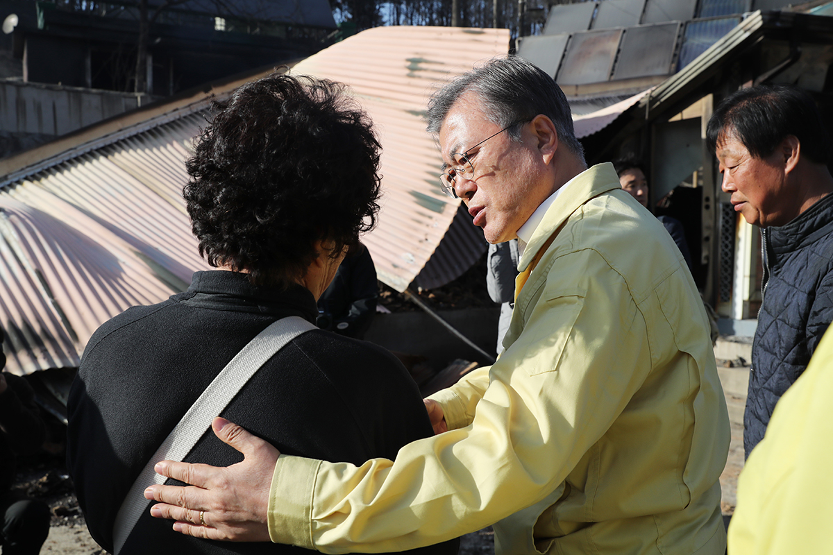 문재인 대통령이 5일 강원 속초시 장사동 장천마을을 방문해 산불 피해자들을 위로하고 있다.