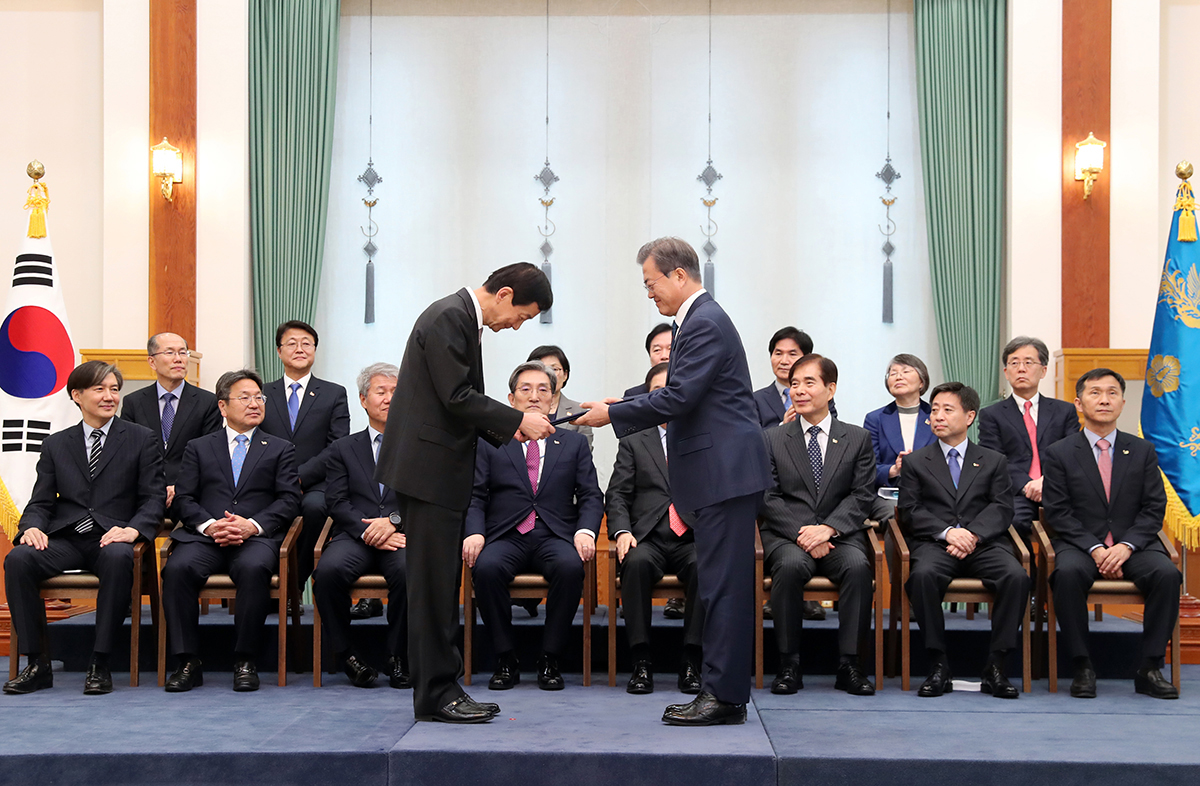 문재인 대통령이 8일 오후 청와대에서 진영 행정안전부 장관에게 임명장을 수여하고 있다.