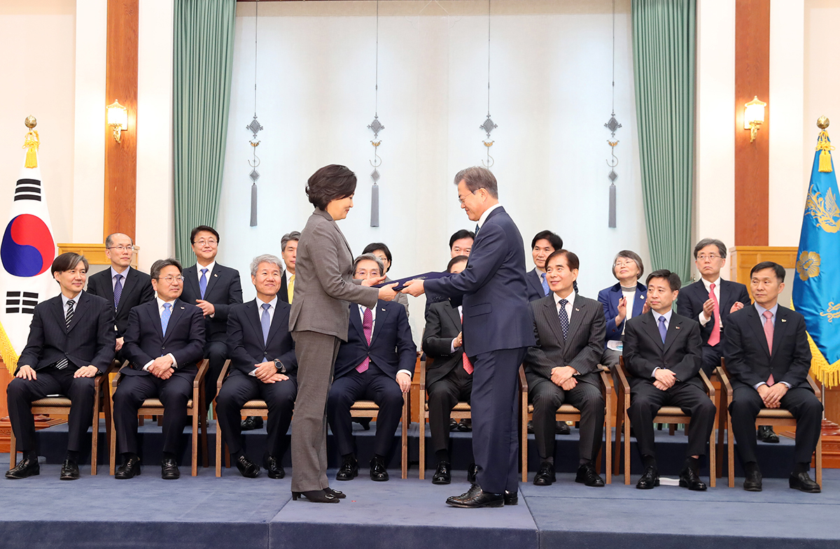 문재인 대통령이 8일 오후 청와대에서 박영선 중소벤처기업부 장관에게 임명장을 수여하고 있다.