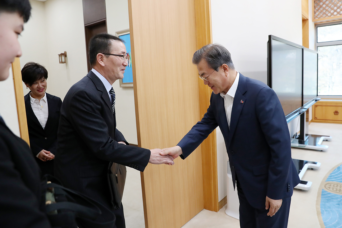 문재인 대통령이 지난 8일 청와대 여민1관 집무실에서 ‘안중근 사건공판 속기록’ 등 근대역사기록 4점을 국가에 기증한 조민기 학생과 가족을 초대해 면담하고 있다. 2019.4.9 사진 청와대제공
