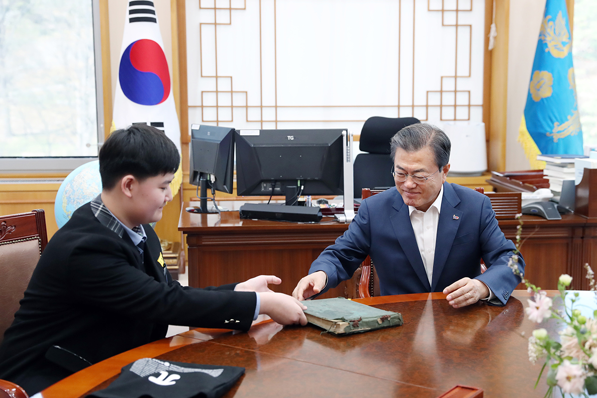 문재인 대통령이 지난 8일 청와대 여민1관 집무실에서 ‘안중근 사건공판 속기록’ 등 근대역사기록 4점을 국가에 기증한 조민기 학생과 가족과의 면담 중 조민기 학생이 추가 기증하기로 한 일본 강점기 및 한국 근현대사가 담긴 ‘사진첩’을 살펴보고 있다. 2019.4.9 사진 청와대제공