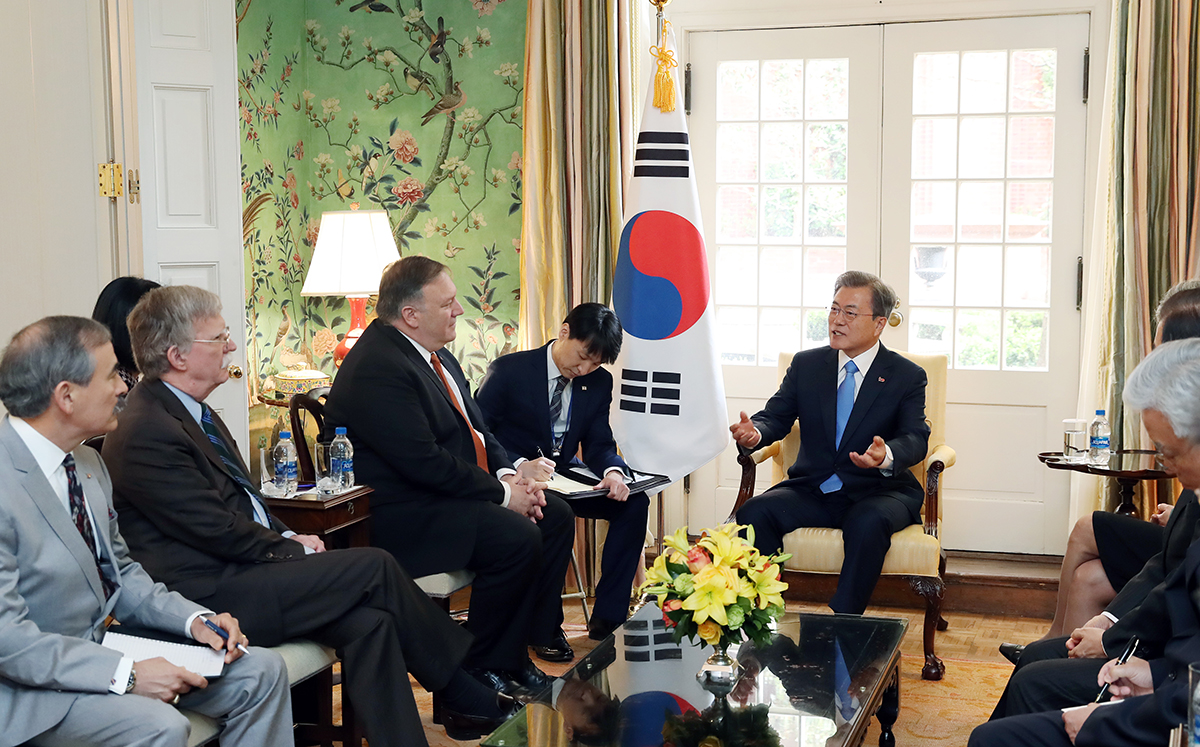 문재인 대통령이 11일 오전(현지시간) 미국 워싱턴 백악관 영빈관(블레어하우스)에서 폼페이오 미 국무장관, 볼튼 국가안보보좌관을 비롯한 관계자들과 대화를 나누고 있다. 2019.4.11