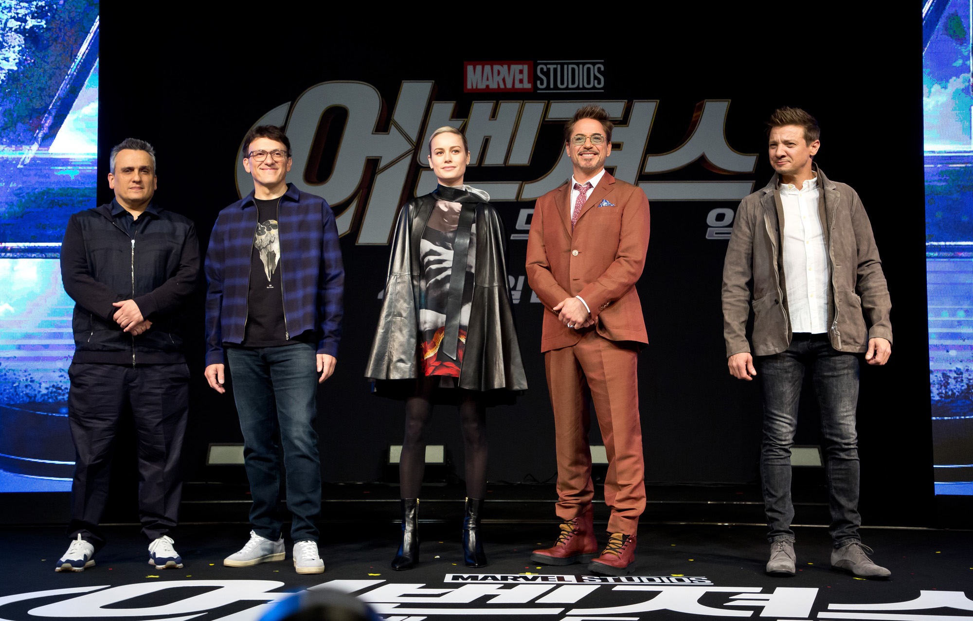 [서울=eoimage] 임준선 기자 =15일 오전 광화문 포시즌스 호텔에서 조 루소 감독, 안소니 루소 감독, 배우 브리 라슨, 로버트 다우니 주니어, 제레미 레너가 참석한 가운데 영화'어벤져스 : 엔드게임' 아시아 프레스 기자간담회가 열리고 있다. 2019.4.15
