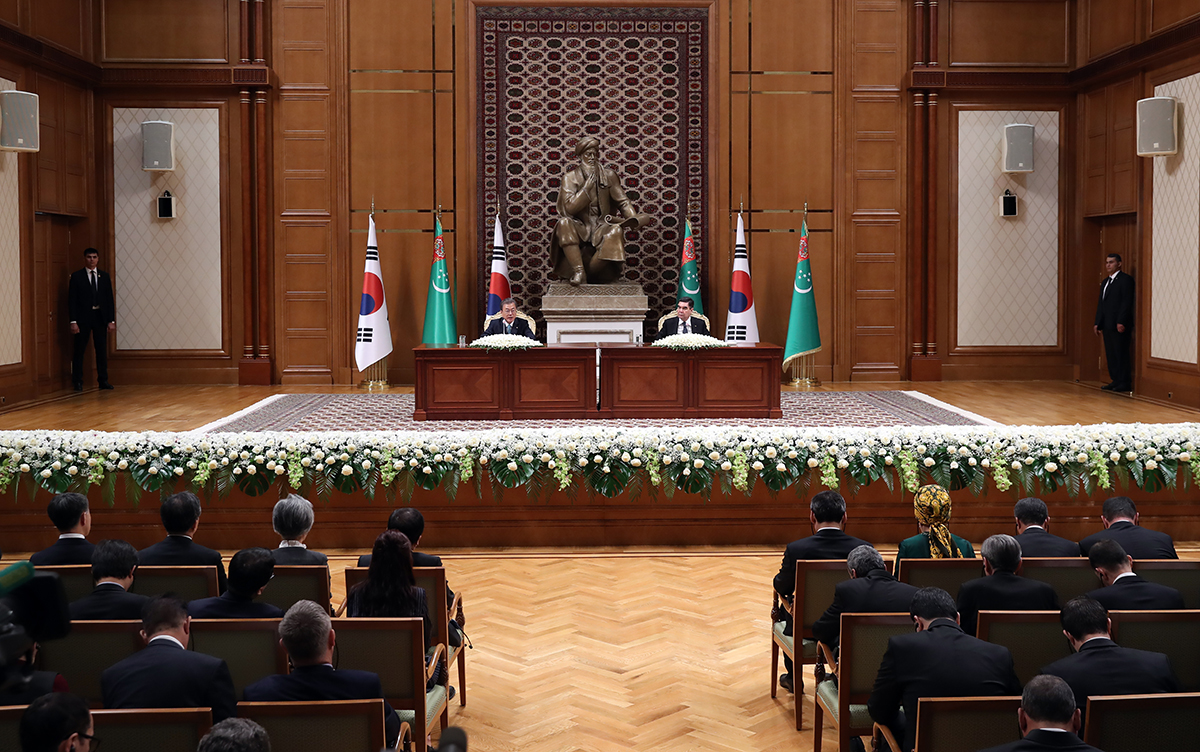 문재인 대통령이 17일(현지시간) 투르크메니스탄 대통령궁에서 구르반굴리 베르디무하메도프 대통령과 정상회담 후 공동기자회견을 하고 있다.
