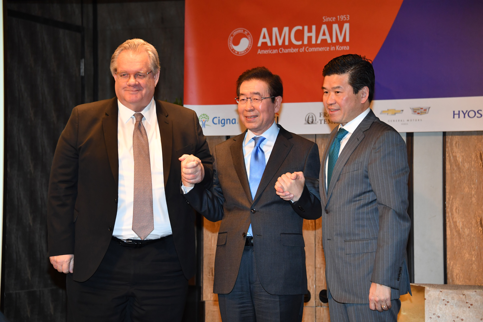 박원순 서울시장이 25일 서울 종로구 포시즌스호텔에서 열린 '주한미국상공회의소(AMCHAM, 암참) 오찬간담회'에서 제임스김 암참 회장과 미세먼지, 블록체인, 일자리창출 등을 주제로 대담을 하고 있다. 서울시 제공
