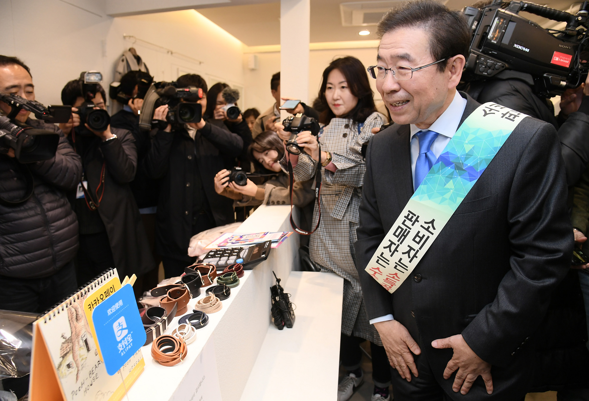 박원순 서울시장이 25일 서울 마포구 경의선 숲길 주변 상점을 방문해 제로페이로 구매 시연을 하고 있다. 서울시 제공