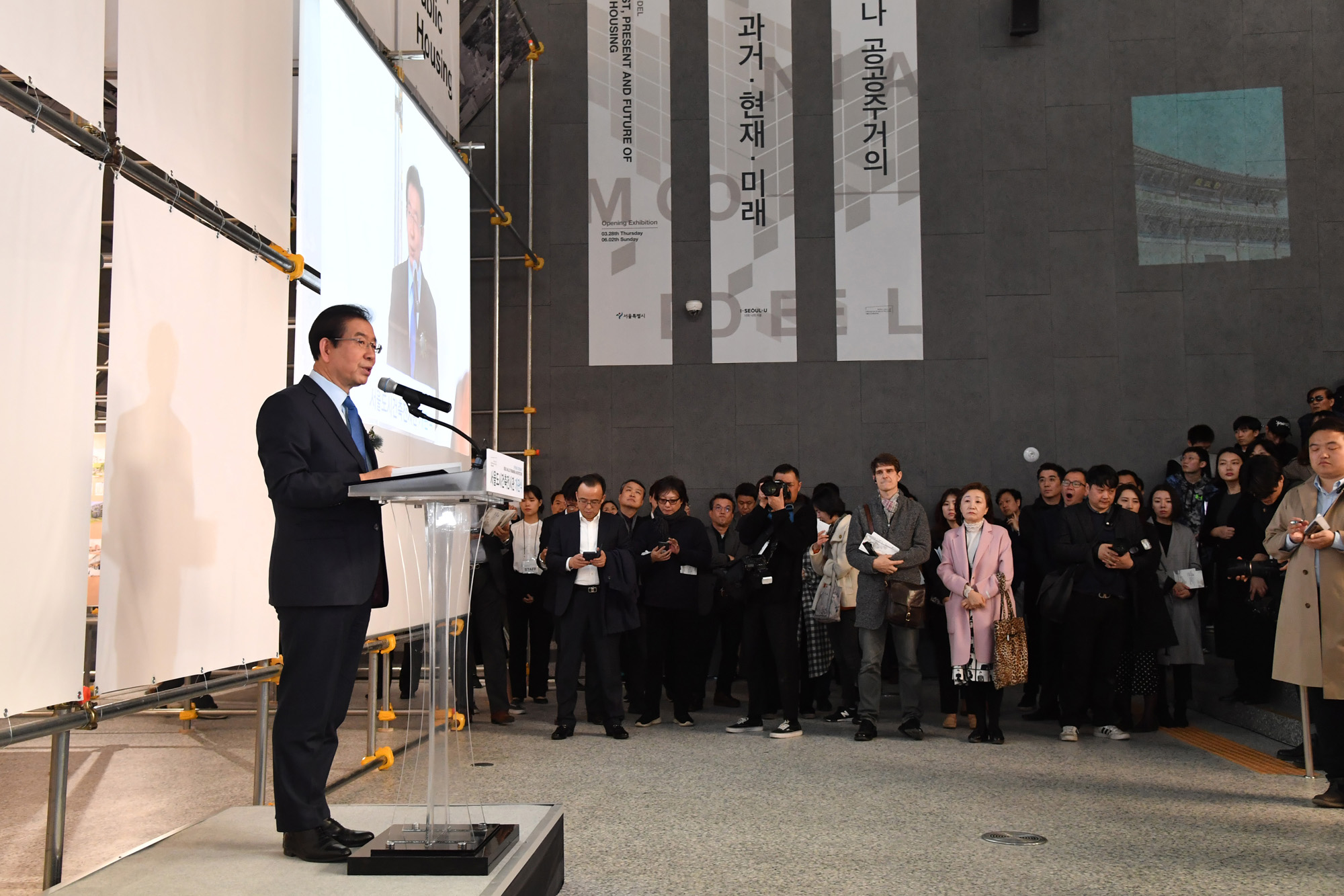 서울시는 2015년 철거했던 옛 국세청 남대문 별관 건물 자리에 '서울도시건축전시관'을 28일 정식 개관했다. 박원선 시장을 비롯한 참석자들이 전시관을 둘러보고 있다. 서울시 제공