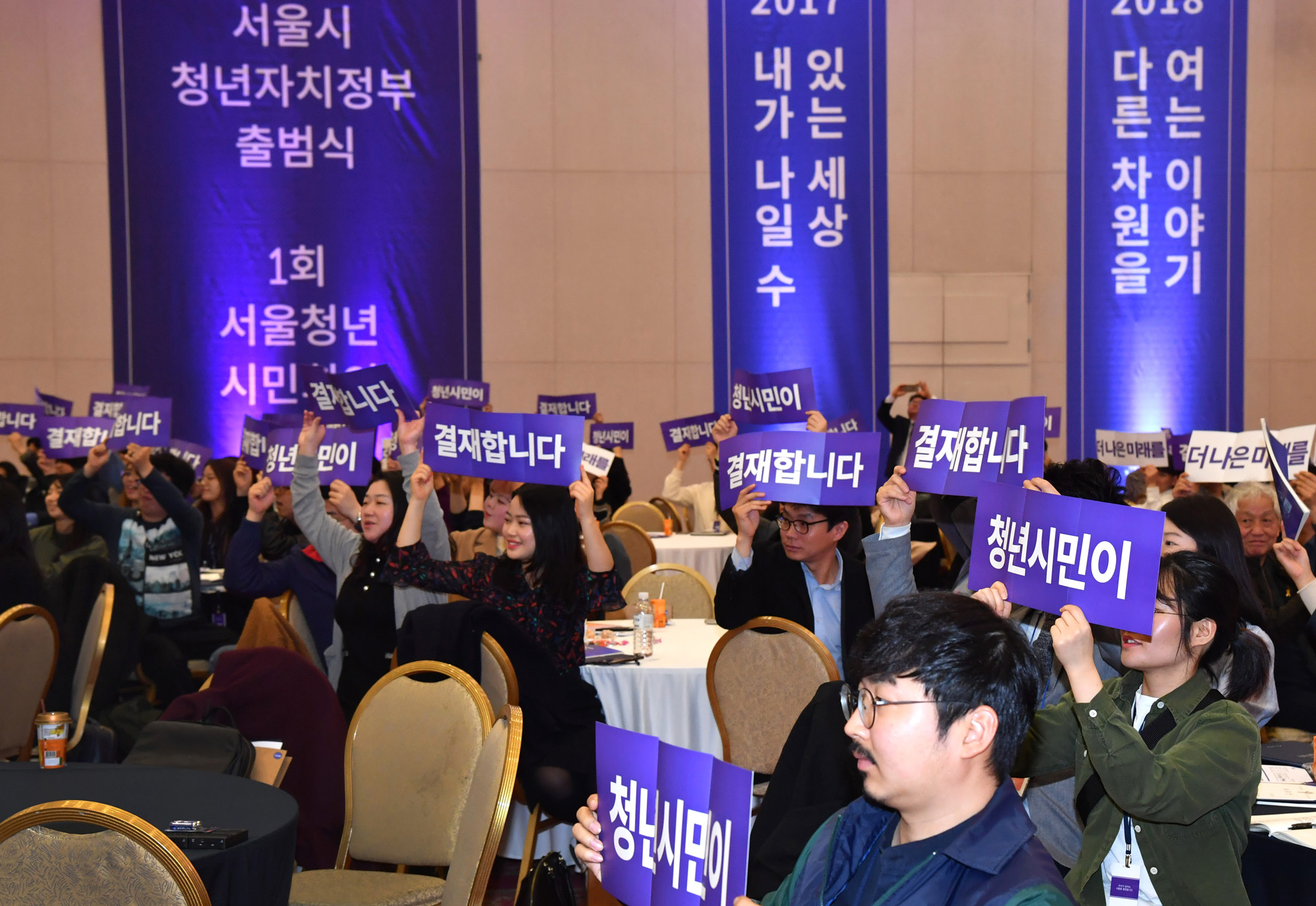 박원순 서울시장이 31일 세종대학교 광개토관에서 열린 '청년자치정부 출범식'에서 피켓을 들고서 추진위원을 위촉하는 퍼포먼스를 하고 있다. 서울시 제공
