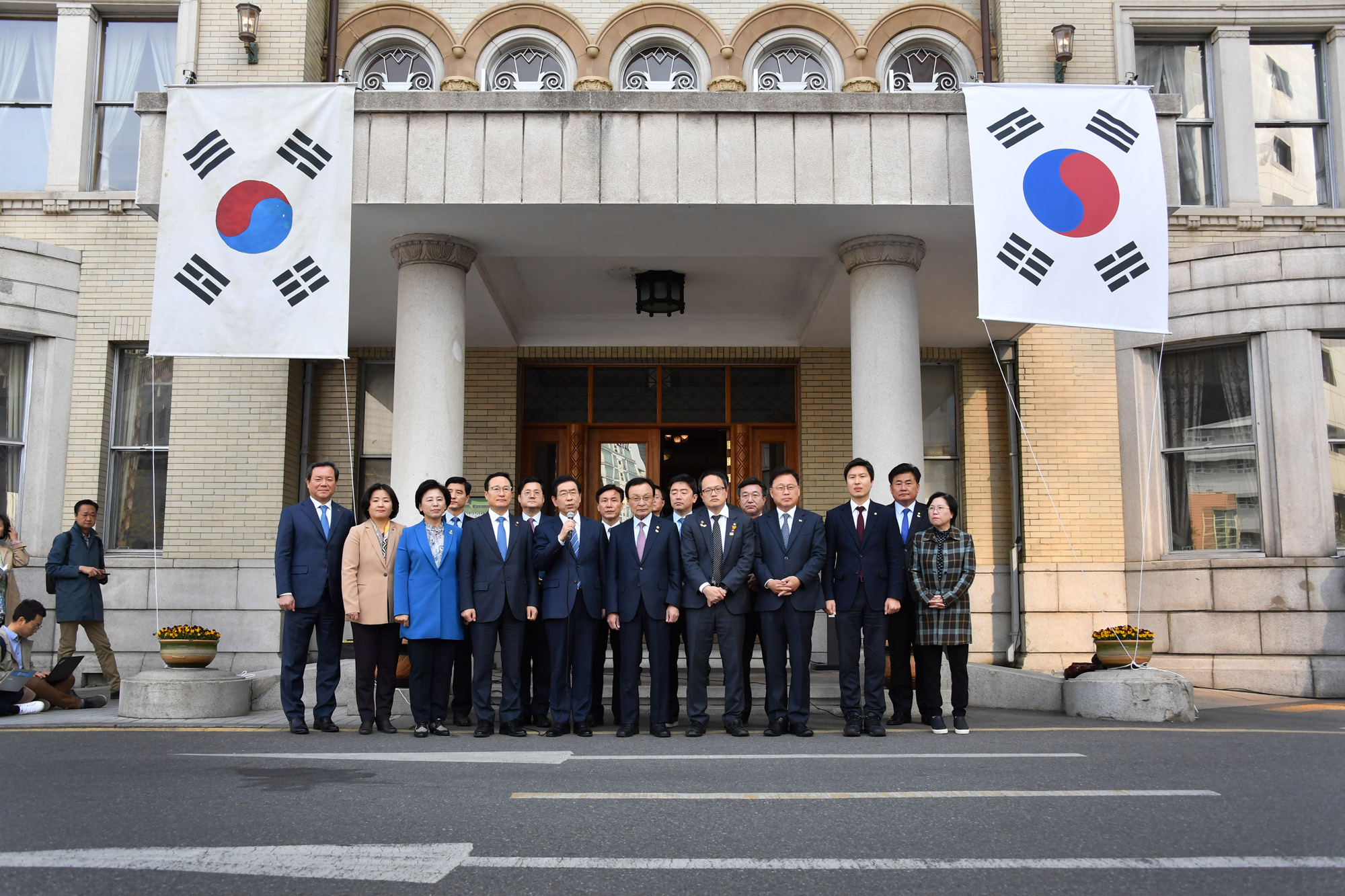 더불어민주당 이해찬 대표, 홍영표 원대대표 등 지도부와 박원순 서울시장이 8일 오전 서울 종로구 경교장에서 임시정부 100주년을 앞두고 열린 현장최고위원회의에 앞서 경교장 내부를 살펴보고 있다. 서울시 제공