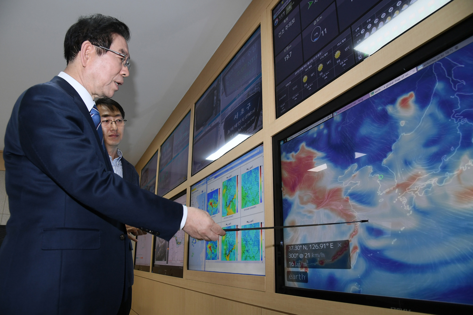 박원순 서울시장이 8일 오후 서울 서초구 보건환경연구원 대기질통합분석센터를 방문해 대기질 모니터링 시스템에 대한 설명을 듣고 있다. 서울시 제공