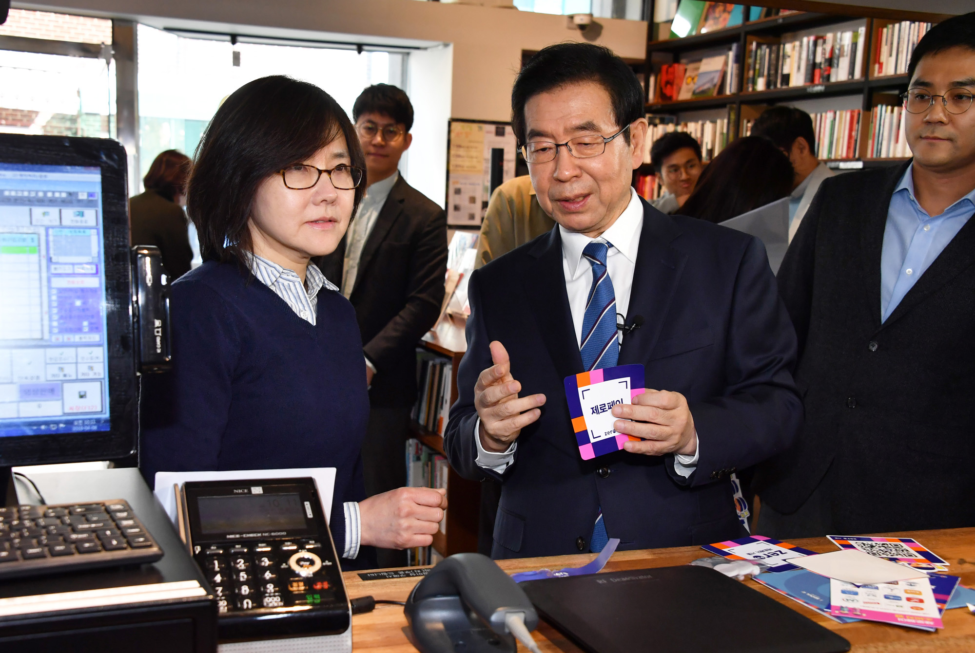 박원순 서울시장이 8일 오전 제로페이 10만 번째 가맹점 ‘역사책방’에서 기념 스티커를 매장에 부착한 후 점주와 기념촬영을 하고 있다. 서울시 제공