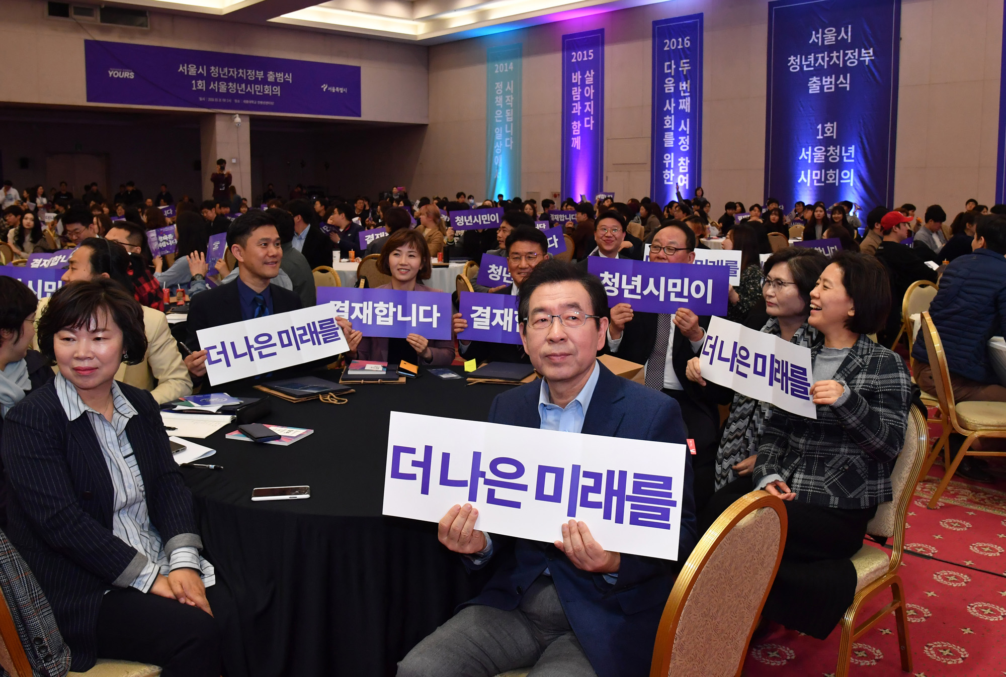 박원순 서울시장이 31일 세종대학교 광개토관에서 열린 '청년자치정부 출범식'에서 피켓을 들고서 추진위원을 위촉하는 퍼포먼스를 하고 있다. 서울시 제공