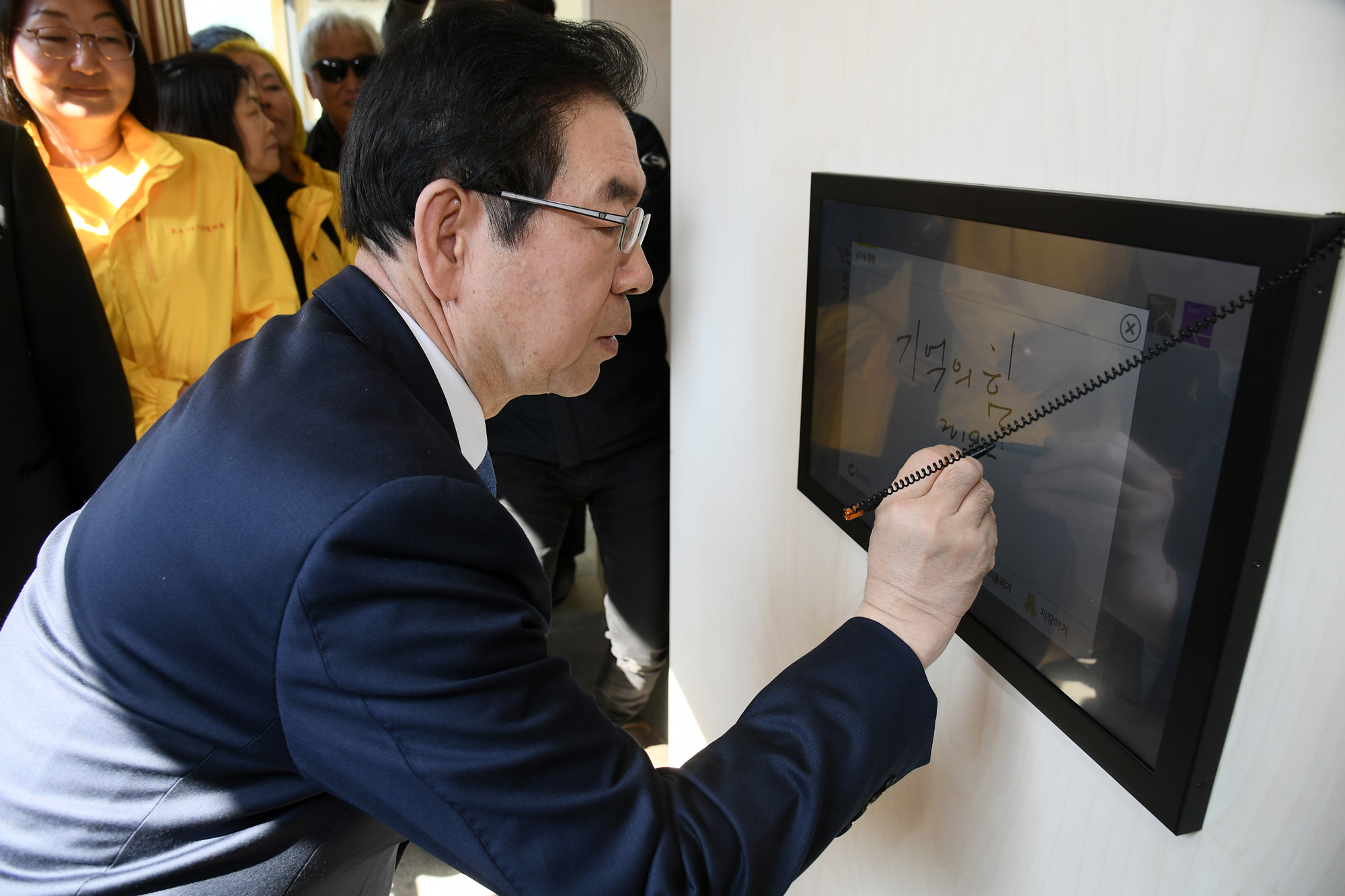 사진설명 | 약 4년 8개월간 서울 광화문광장을 지킨 세월호 천막이 떠난 자리에 12일 서울시의 추모시설인 '기억·안전 전시공간'이 문을 열었다. 이 공간은 79.98㎡(약 24평) 규모의 목조 건물로 전시실 2개와 시민참여공간, 안내공간으로 구성된다. 이날 오후 열린 개관식에서 더불어민주당 송영길 의원(왼쪽부터), 박원순 서울시장, 박영선 중소벤처기업부 장관, 유가족이 공간을 둘러보고 있다. 서울시 제공 |