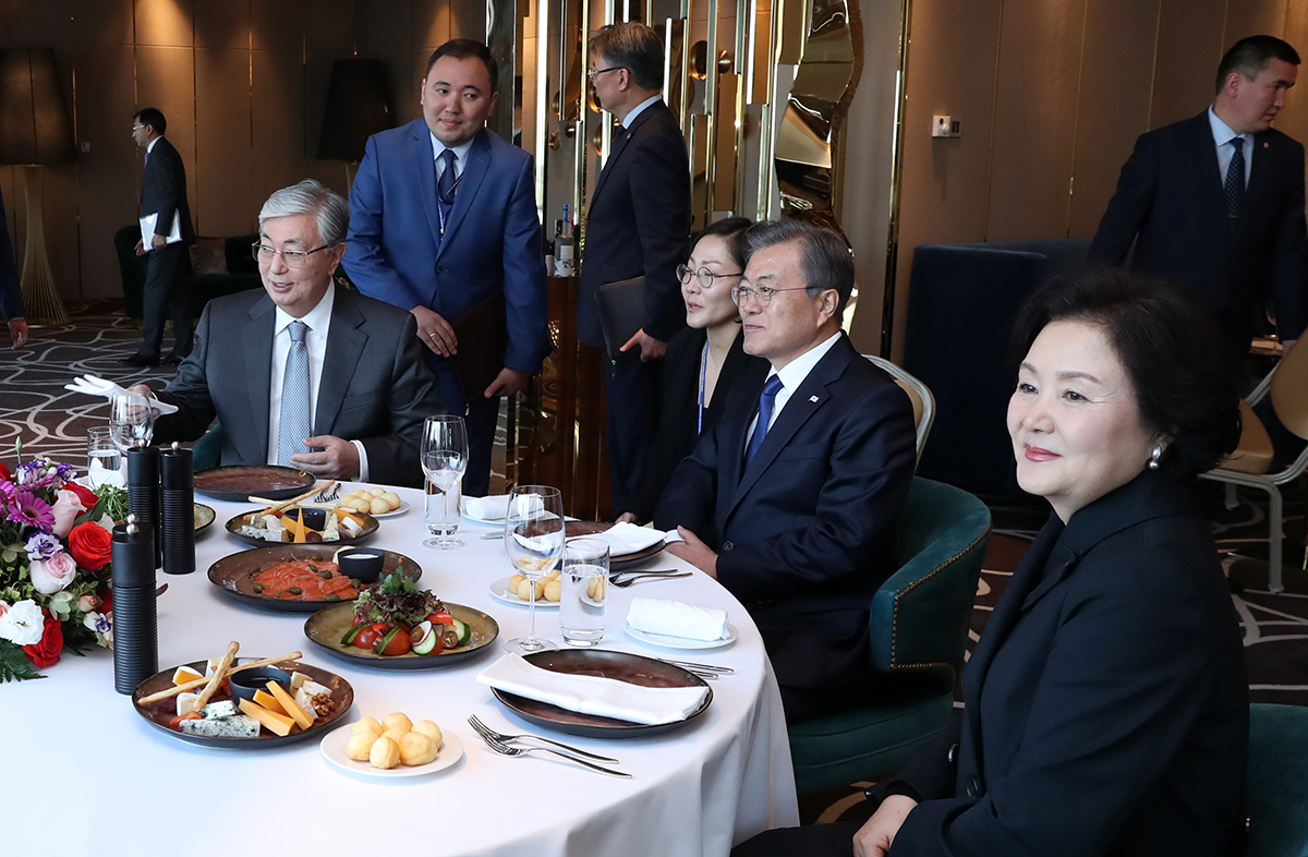 카자흐스탄 국빈 방문 중인 문재인 대통령이 20일(현지시간) 누르술탄에 마련된 숙소에서 카심-조마르트 토카예프 대통령과 환담을 나누고 있다. 2019.04.21