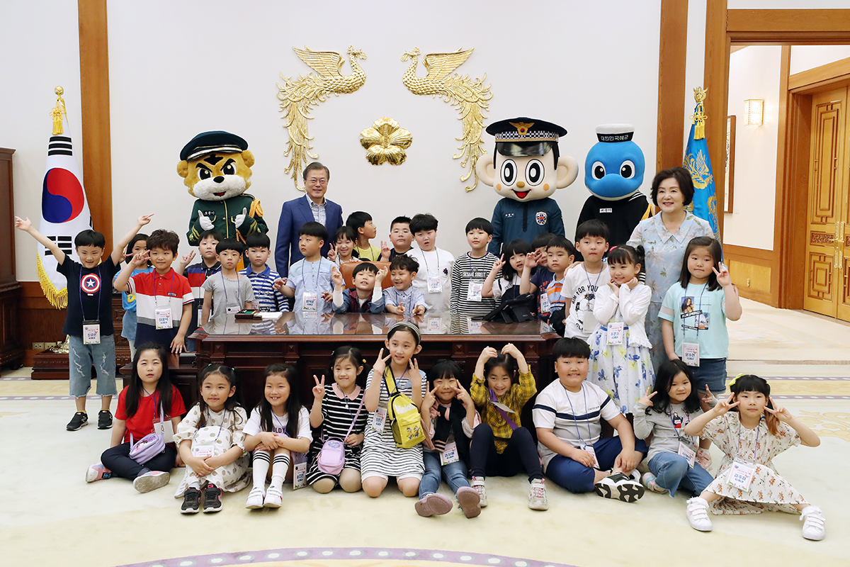 어린이날인 5일 오후 청와대 영빈관에서 열린 ‘2019년 어린이날 청와대 초청행사’에 참석한 어린이들과 기념사진을 찍고 있다. 2019.5.5