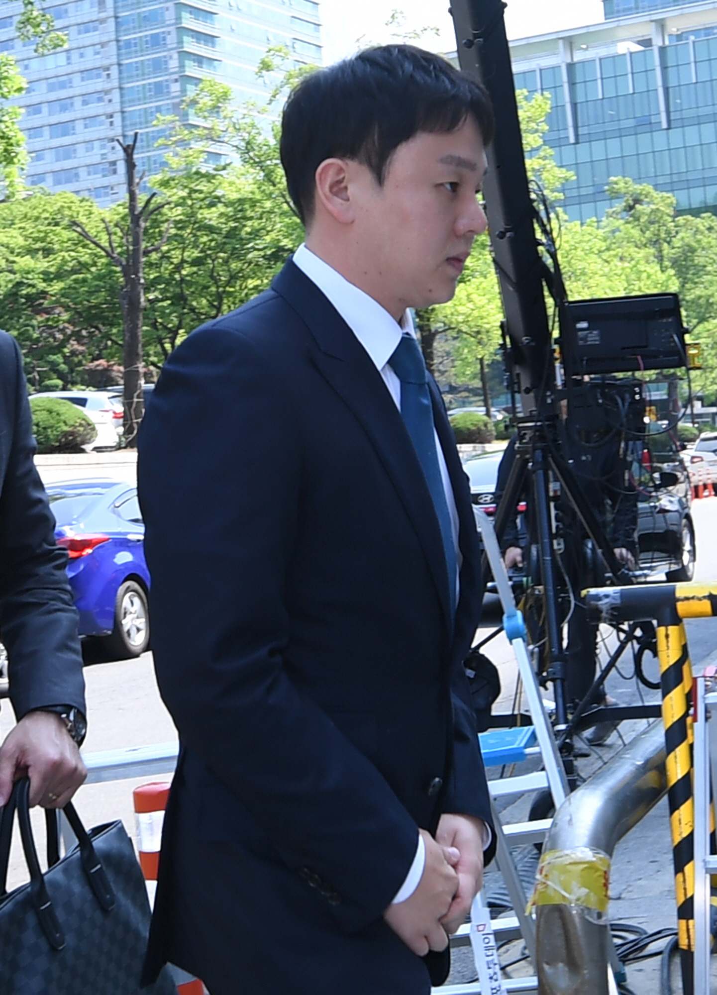 [서울=eoimage] 고성준 기자 = 유인석 전 유리홀딩스 대표가 14일 오전 서울 서초구 서울중앙지방법원에서 열린 영장실질심사에 출석하고 있다. 2019.5.14