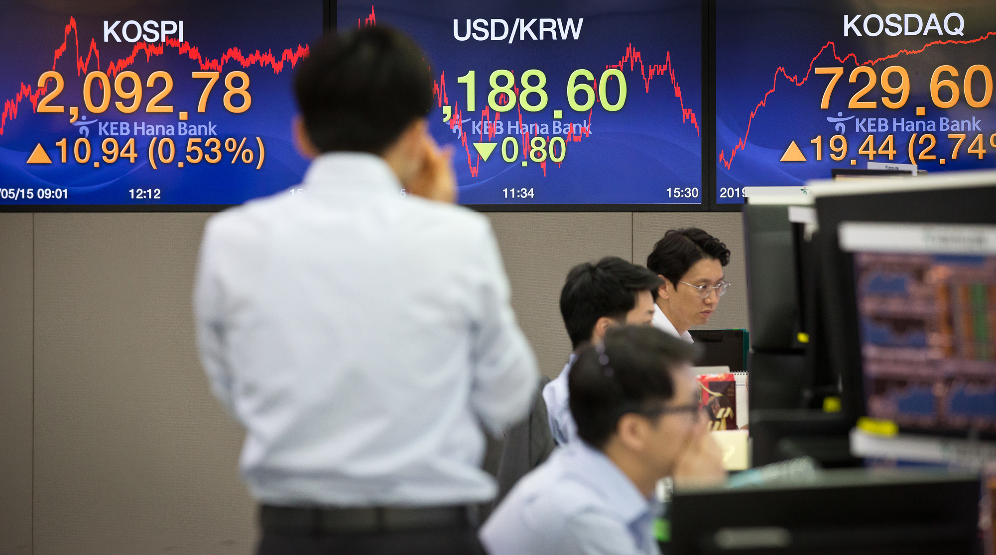 | 사진설명 | [서울=eoimage] 임준선기자 = 코스피 지수가 전 거래일 대비 10.94포인트(0.53%) 오른 2092.78에 마감한 15일 오후 서울 중구 KEB하나은행 딜링룸에서 딜러들이 업무를 보고 있다. 이날 코스닥 지수는 전 거래일보다 19.44포인트(2.74%) 오른 729.60에 마감했고, 서울 외환시장에서 원·달러 환율은 전 거래일(1189.4원) 대비 0.8원 내린 1188.6원에 마감했다. 2019.5.15 |