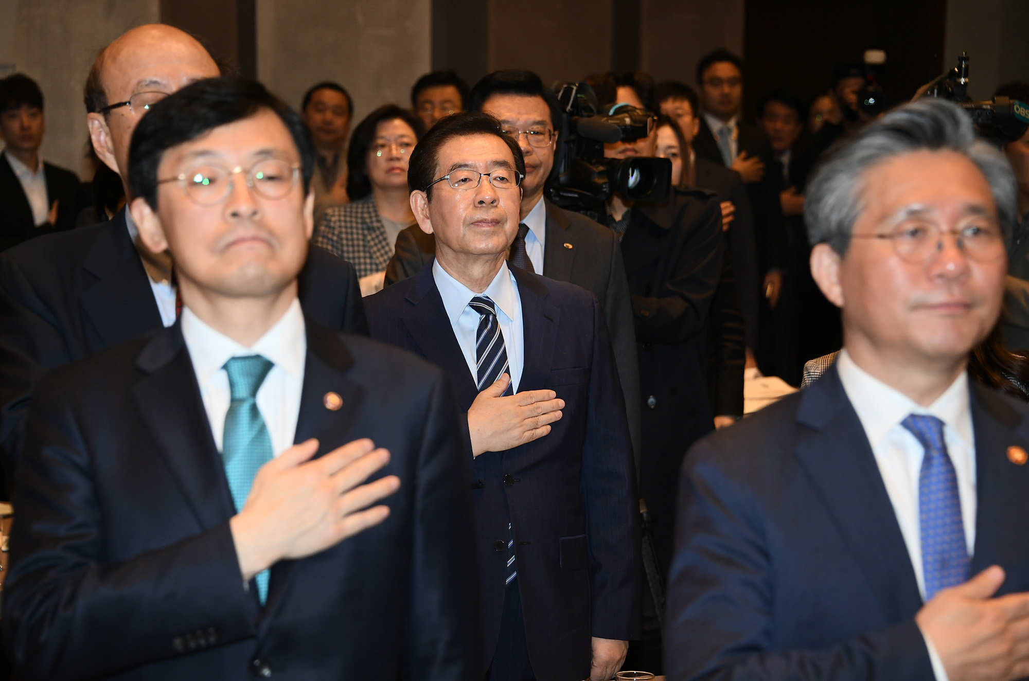 29일 오전 서울 중구 프레스센터에서 열린 국가기후환경회의 출범식에서 박원순 서울시장이 축사를 하고 있다. 서울시 제공