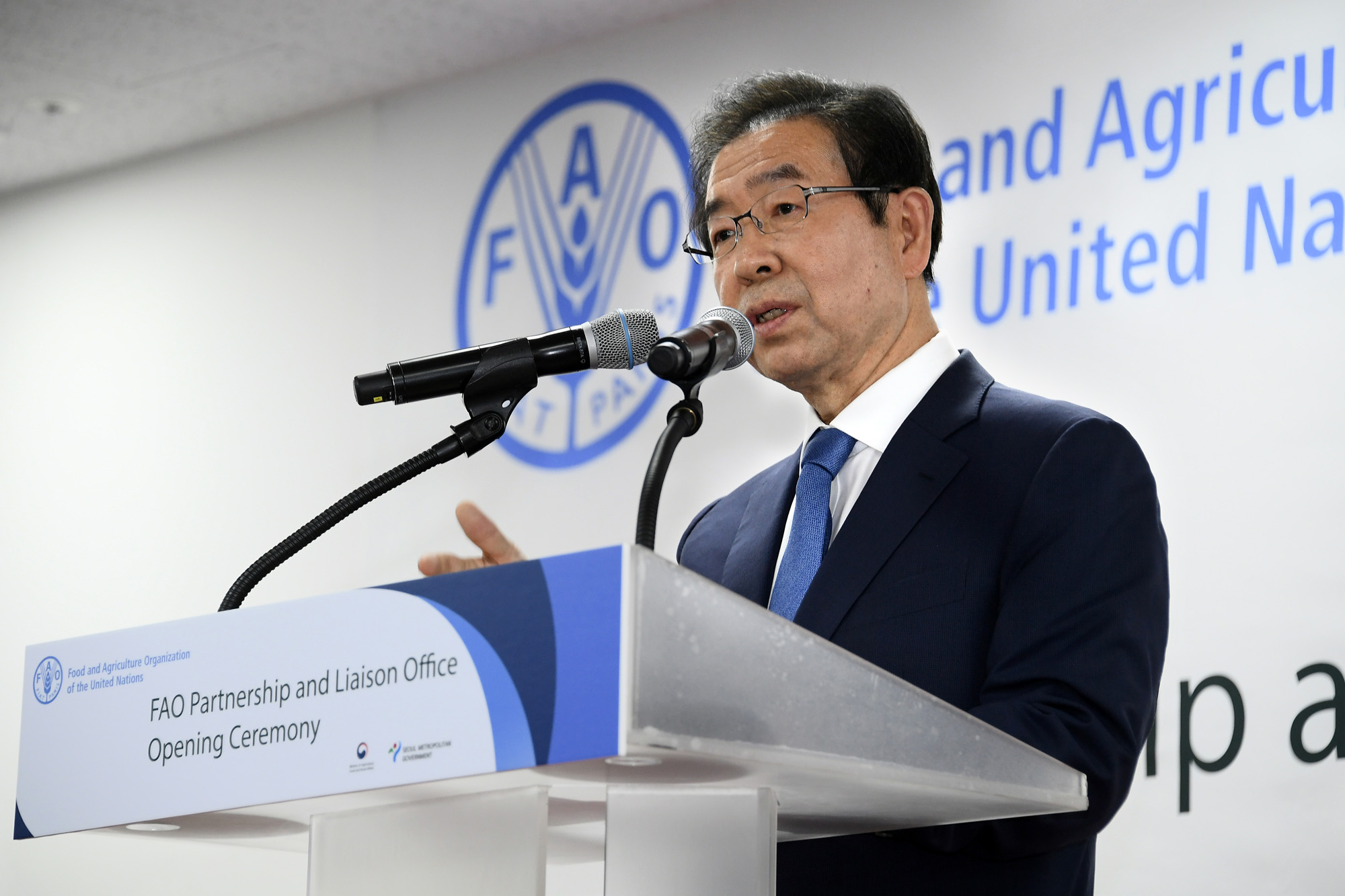 박원순 서울시장, 이개호 농림축산식품부 장관, 호세 그라지아노 다 실바 사무총장(왼쪽부터)이 13일 오후 서울 종로구 서울글로벌센터에서 열린 국제연합식량농업기구(FAO) 한국 협력연락사무소 개소식에 참석하고 있다. 서울시 제공