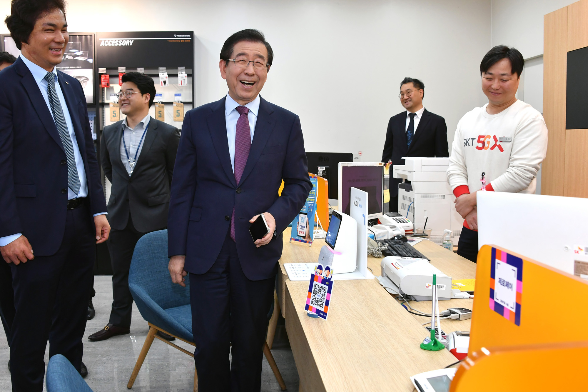 박원순 서울시장(왼쪽)이 16일 서울시청 인근 SK텔레콤 대리점에서 제로페이로 스마트폰 보호필름을 구입하고 있다. 서울시 제공