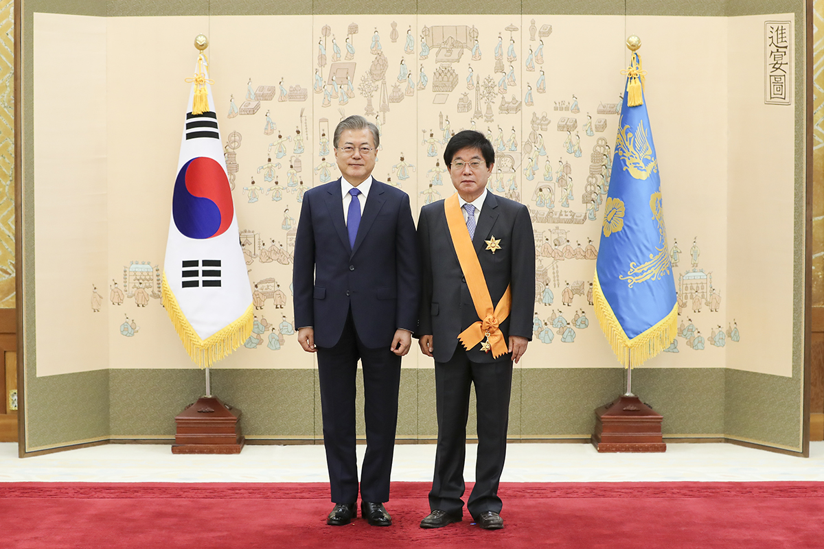 문재인 대통령이 17일 청와대에서 열린 퇴임 헌법재판소 재판관 훈장 수여식에서 서기석 전 헌법재판관과 기념촬영하고 있다. 2019.05.17.