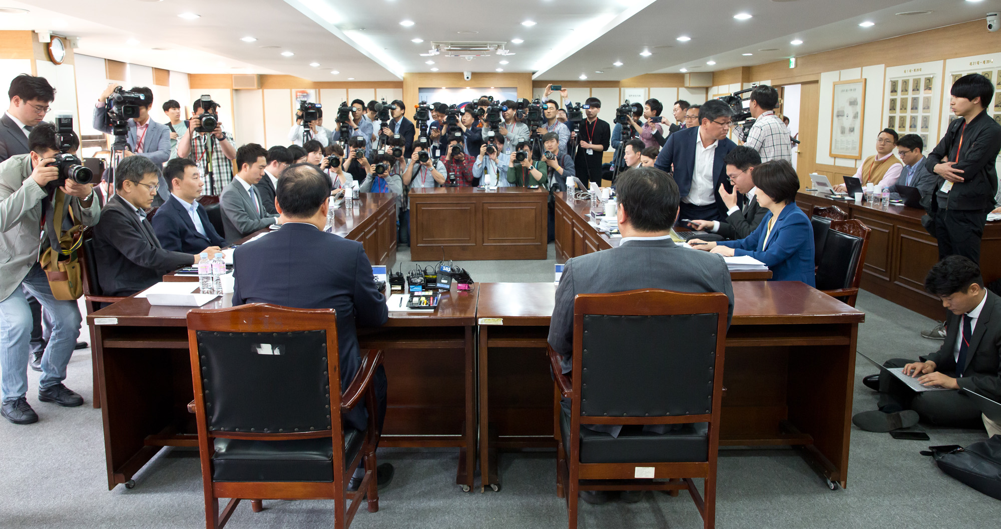 | 사진설명 | [과천=Eoimage] 임준선 기자 = 정한중 법무부 검찰 과거사위원장 대행과 문준영 법무부 검찰과거사위원회 위원이 20일 오후 경기도 과천시 관문로 정부과천청사 법무부 대회의실에서 열린 '법무부 검찰과거사위원회(과거사위) 회의'를 마친 뒤, 고(故) 장자연씨 사망 의혹 사건의 재수사 권고 여부를 발표하고 있다. 2019.5.20 |