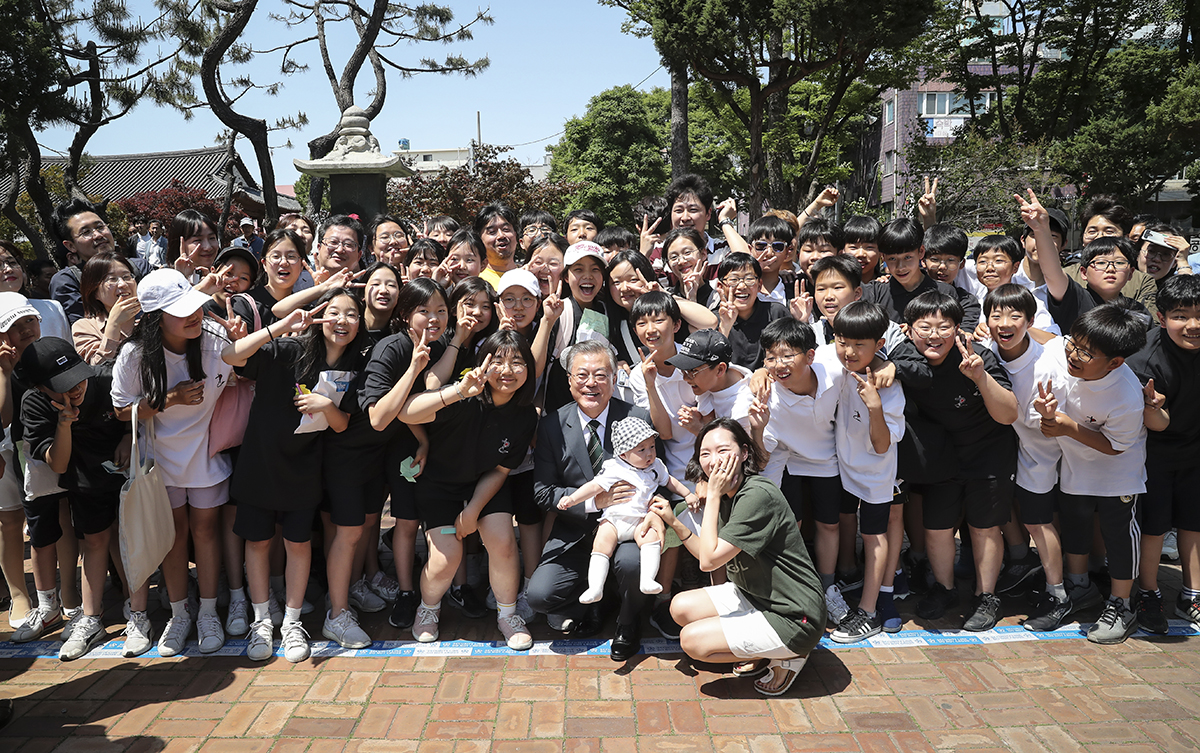 문재인 대통령이 22일 충북 청주중앙공원을 방문해 역사유적지를 둘러본 후 시민들과 기념 촬영을 하고 있다.