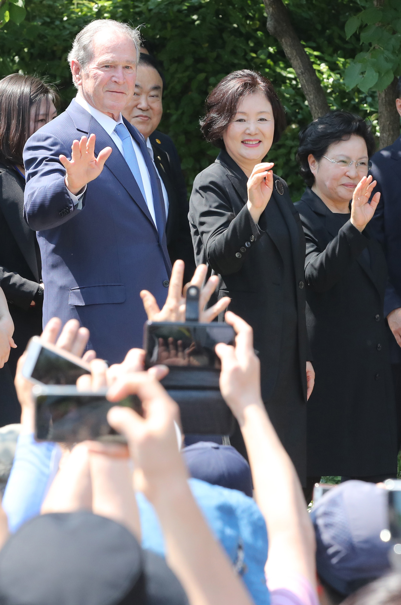 23일 부시 전 대통령과 김정숙여사,권양숙여사가 김해시 진영읍 봉하마을 사저에서 고 노무현 대통령 서거 10주기 추도식에 참석하기 위해 이동하고 있다. 이날 부시 전 대통령은 자신 직접 그린 노대통령 초상화를 전달하고 묘역을 참배했다.20190523