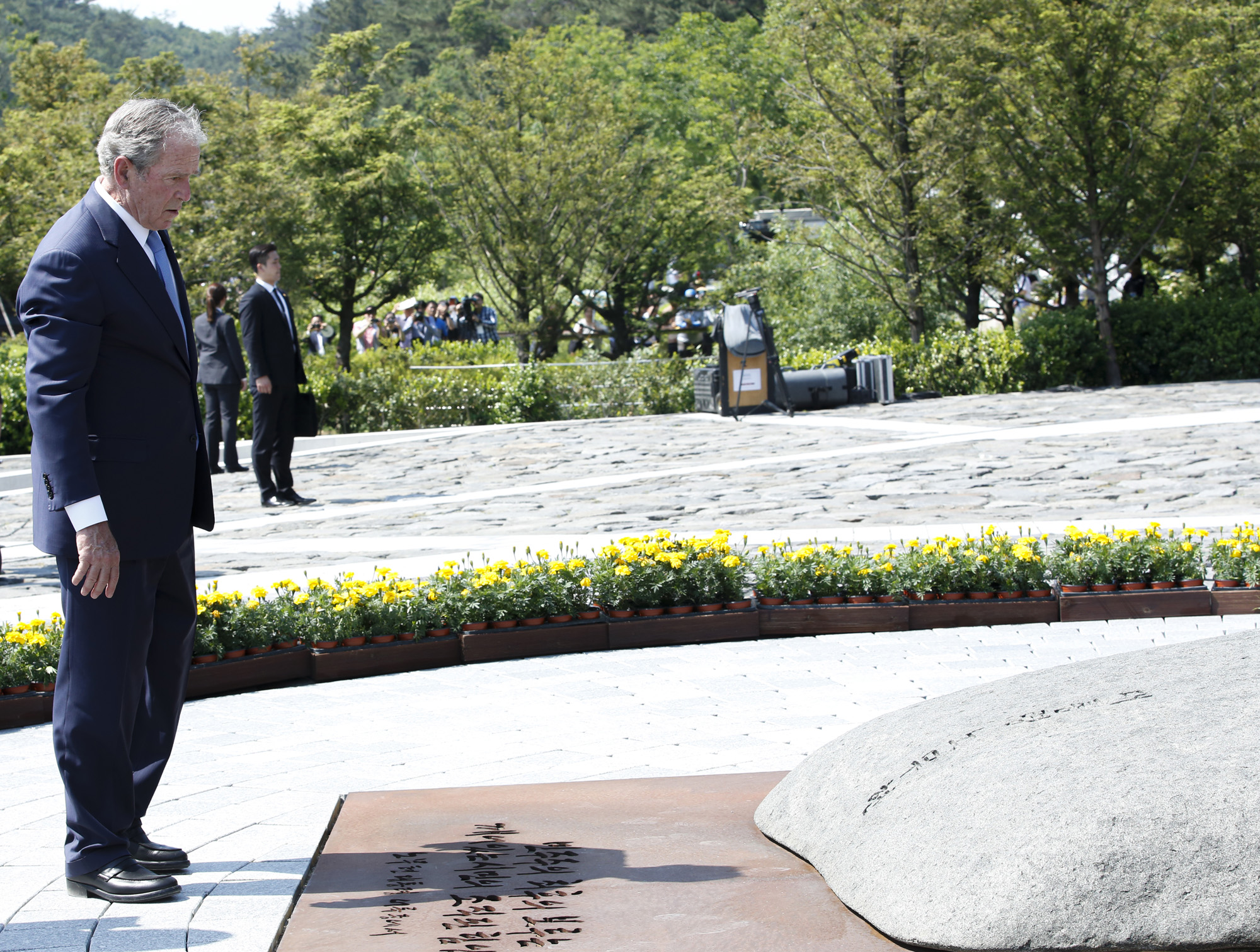 조지 부시 전 미국 대통령이 23일 경남 김해 봉하마을에서 열린 故 노무현 전 대통령 서거 10주기 추도식에 참석해 묘역참배를 하고 있다.