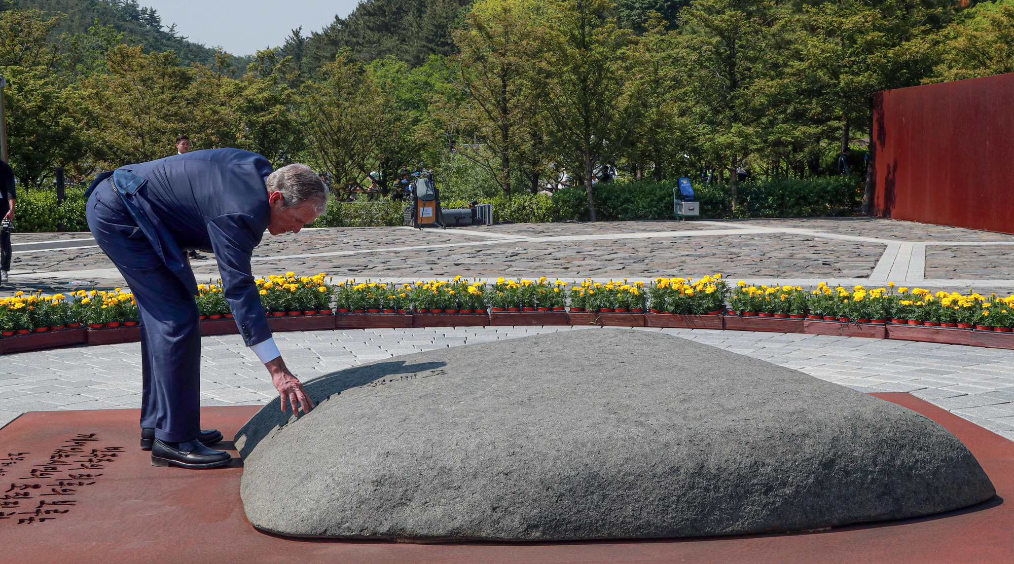 조지 부시 전 미국 대통령이 23일 경남 김해 봉하마을에서 열린 故 노무현 전 대통령 서거 10주기 추도식에 참석해 묘역참배를 하고 있다.