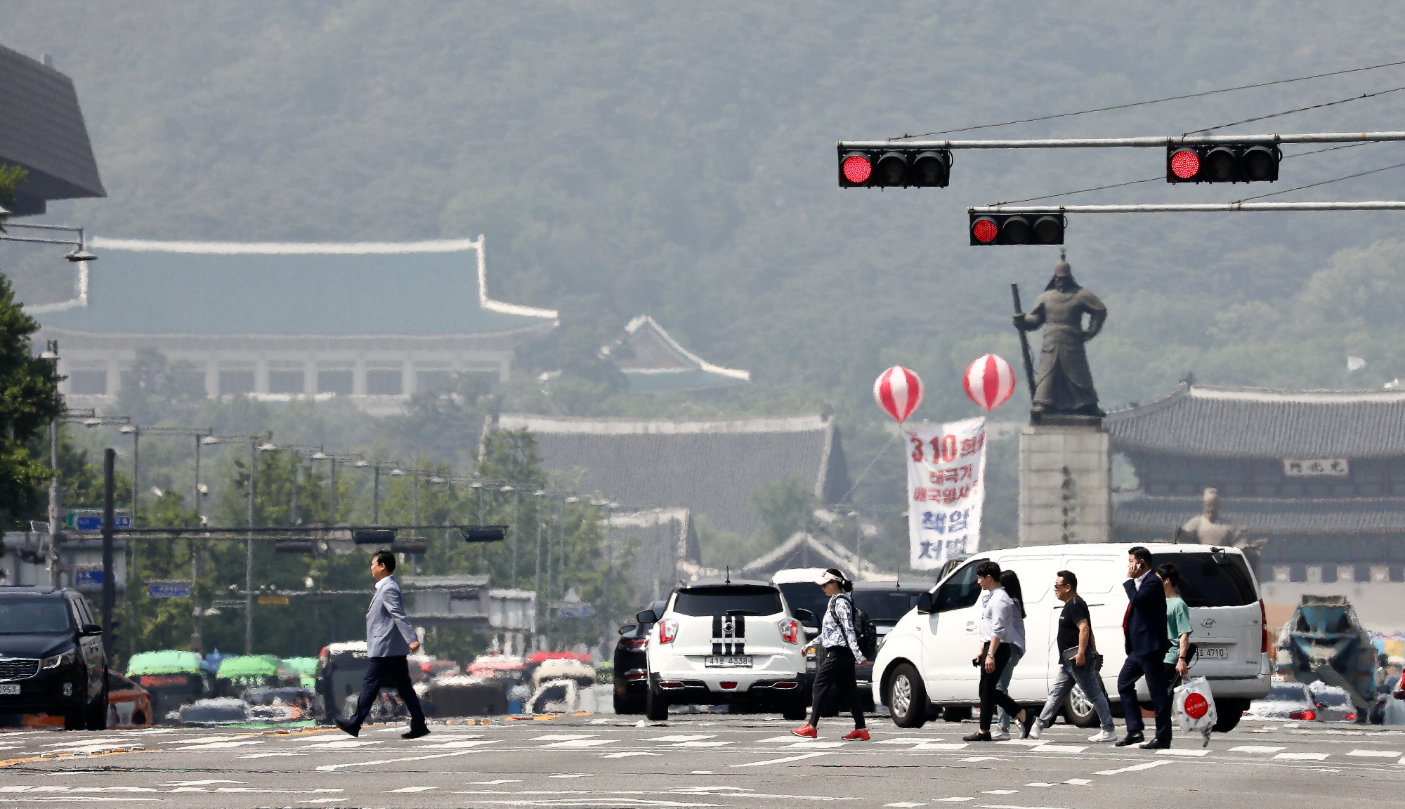 [서울=eoimage] 고성준 기자 = 서울에 첫 폭염주의보가 내려진 24일 오후 서울 광화문광장 일대에서 시민들이 아지랑이 핀 횡단보도를 건너고 있다. 2019.5.24