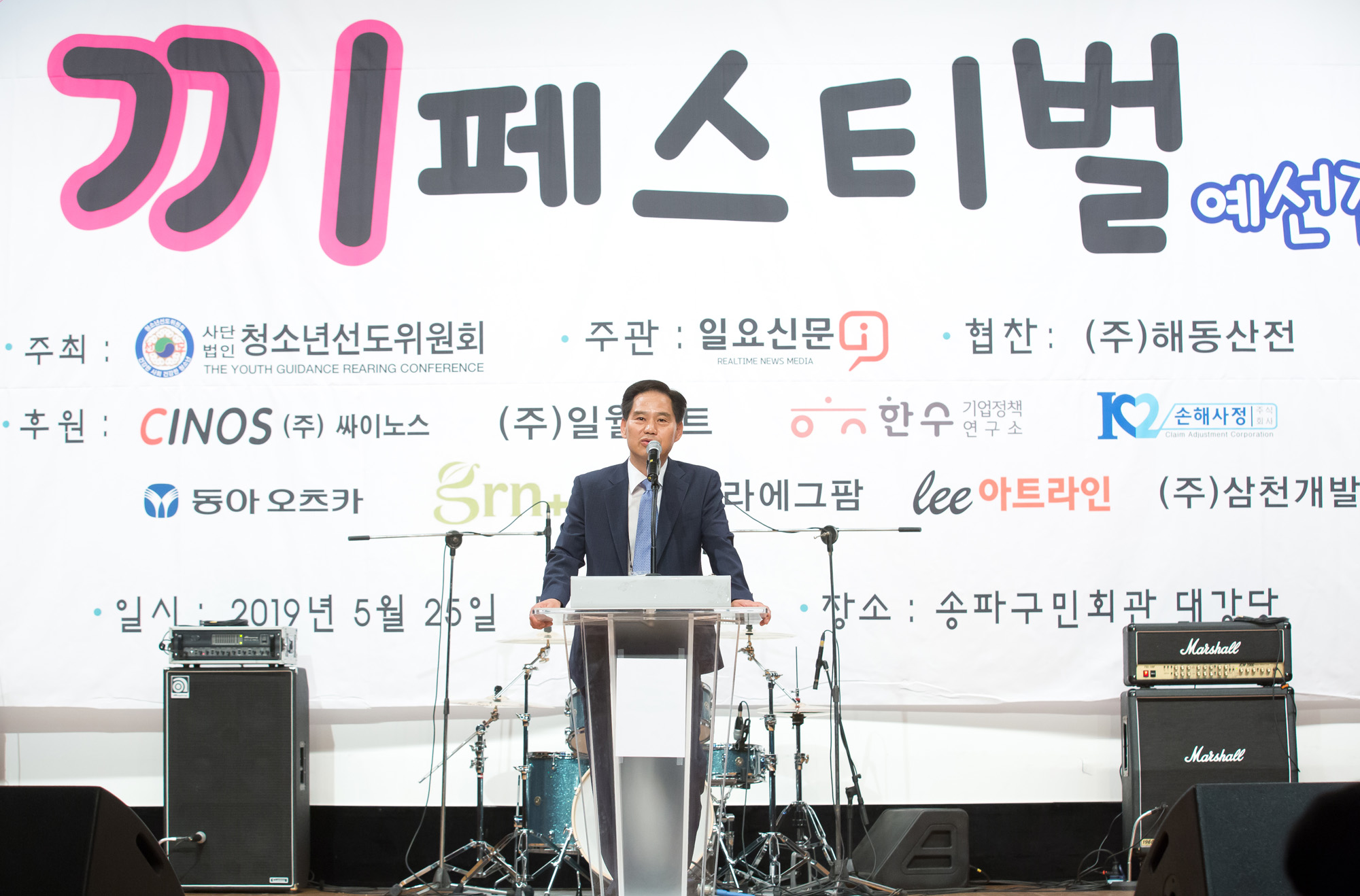 [eoimage=서울] 임준선기자 = ‘제9회 대한민국 청소년 끼 페스티벌’ 서울· 경기 ·인천 예선전이 25일 서울 송파구민회관에서 초·중·고교 60여개팀이 참가한 가운데 댄스, 노래,밴드,국악, 치어리딩 등 다양한 부문으로 나뉘어 경연이 펼쳐지고 있다. 사진은 이삼구 대회장이 인사말을 하고 있다. 2019.5.25.eomaster@eoimage.com |