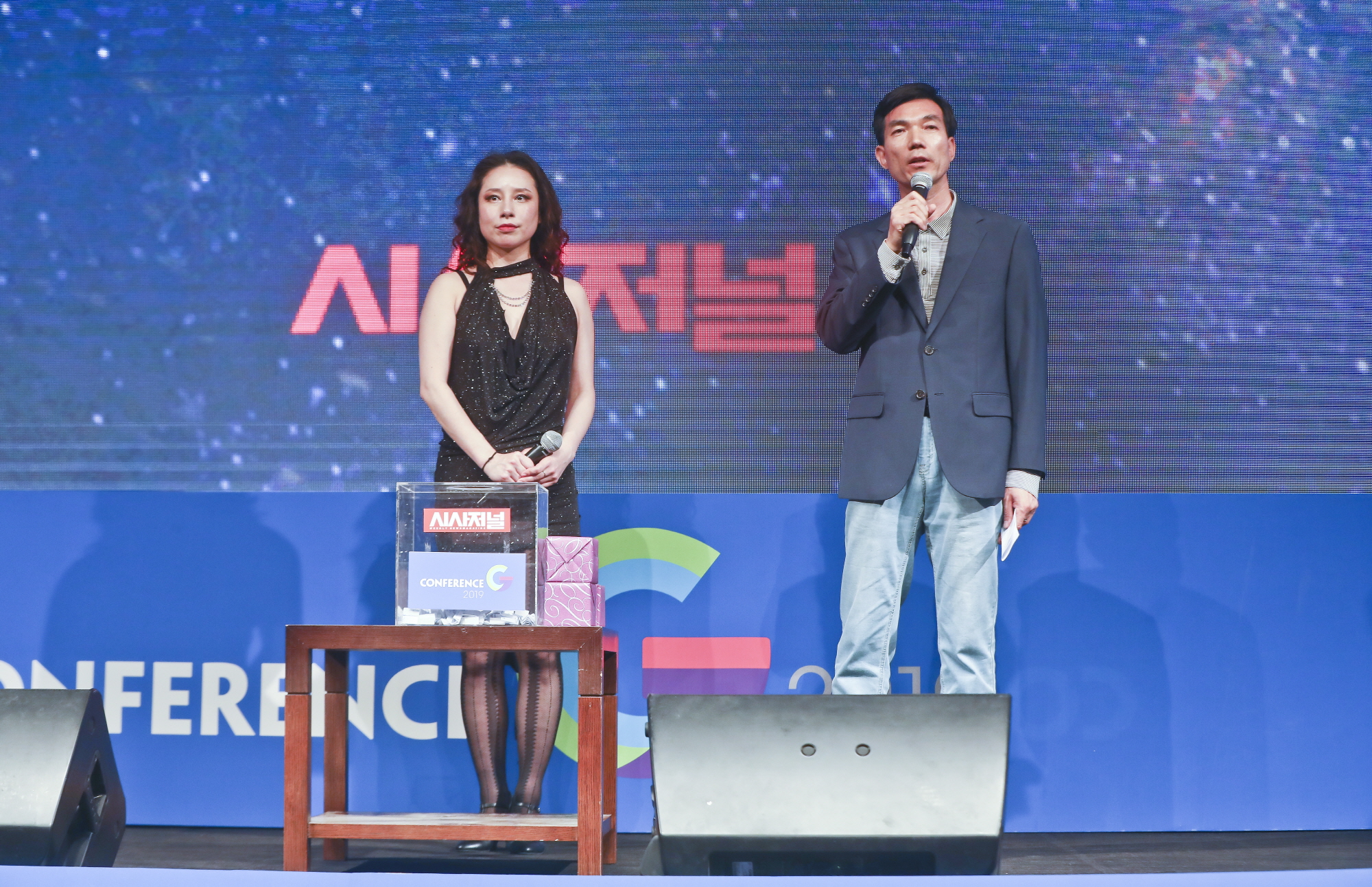[서울=eoimage] 고성준 기자 = 30일 서울 중구 신라호텔에서 열린 '컨퍼런스G 2019'에서 소종섭 시사저널 편집국장이 경품추첨을 하고있다. 2019.5.30
