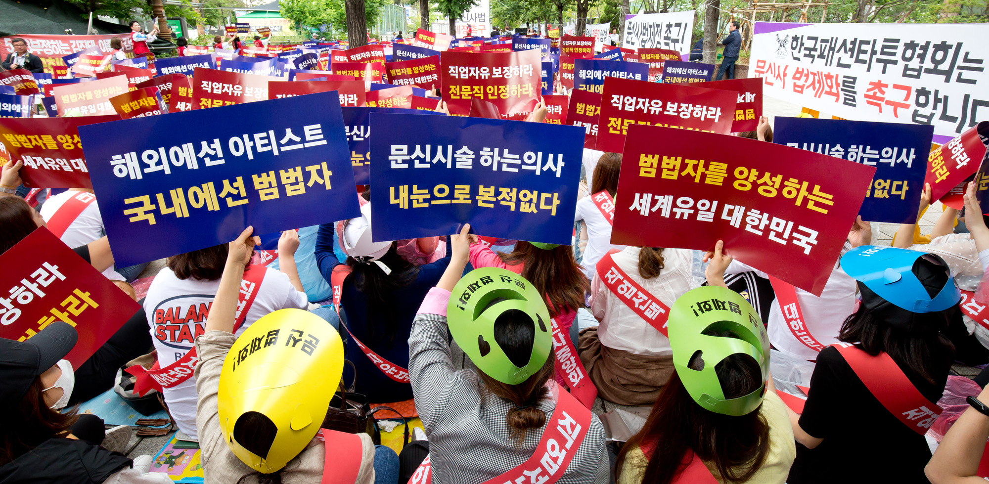 [서울=eoimage] 임준선기자 =10일 오전 여의도 국민은행 서관앞에서 대한문신사중앙회 회원들이 문신사 법제화 촉구 결의대회를 하고 있다.(사진 사용시 인물 모자이크 요망.) 2019.6.10