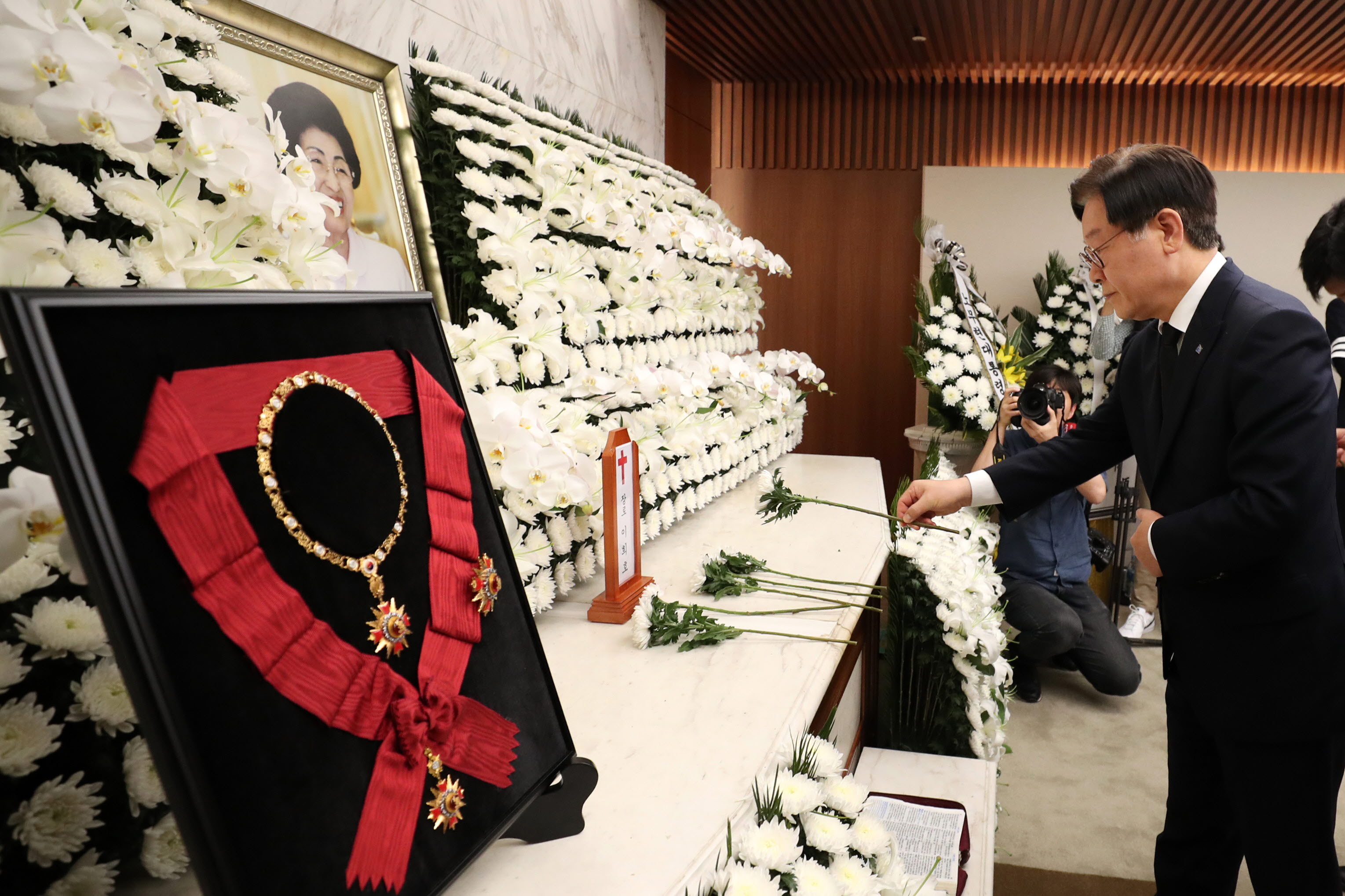 [서울=eoimage] 고성준 기자 = 이재명 경기도지사가 12일 서울 서대문구 신촌 세브란스병원 장례식장에 마련된 고 이희호 여사의 빈소를 찾아 조문하고 있다. 2019.6.12