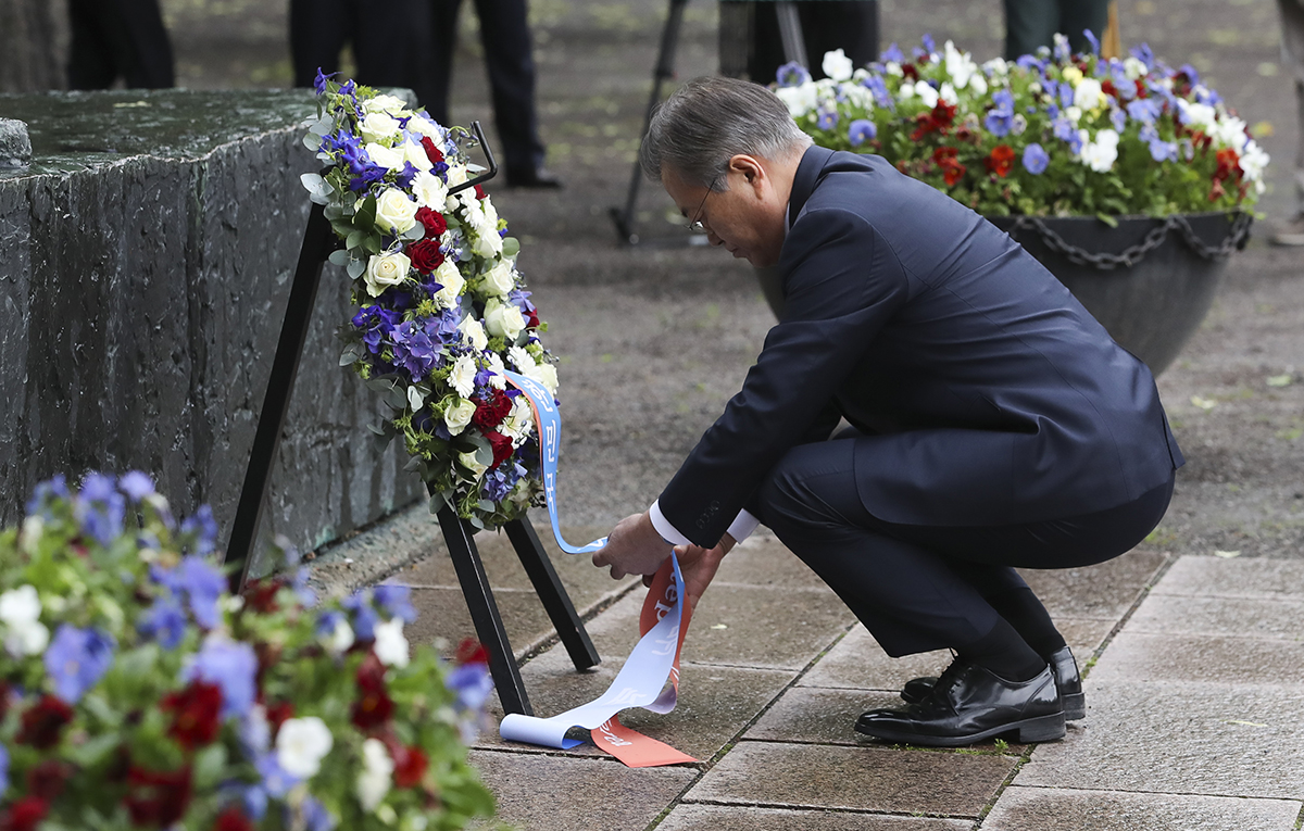 노르웨이를 국빈 방문 중인 문재인 대통령이 12일(현지시각) 오전 오슬로 아케스후스 성에 위치한 2차세계대전 추모비에 헌화하고 있다. 2019.06.12 사진 청와대제공