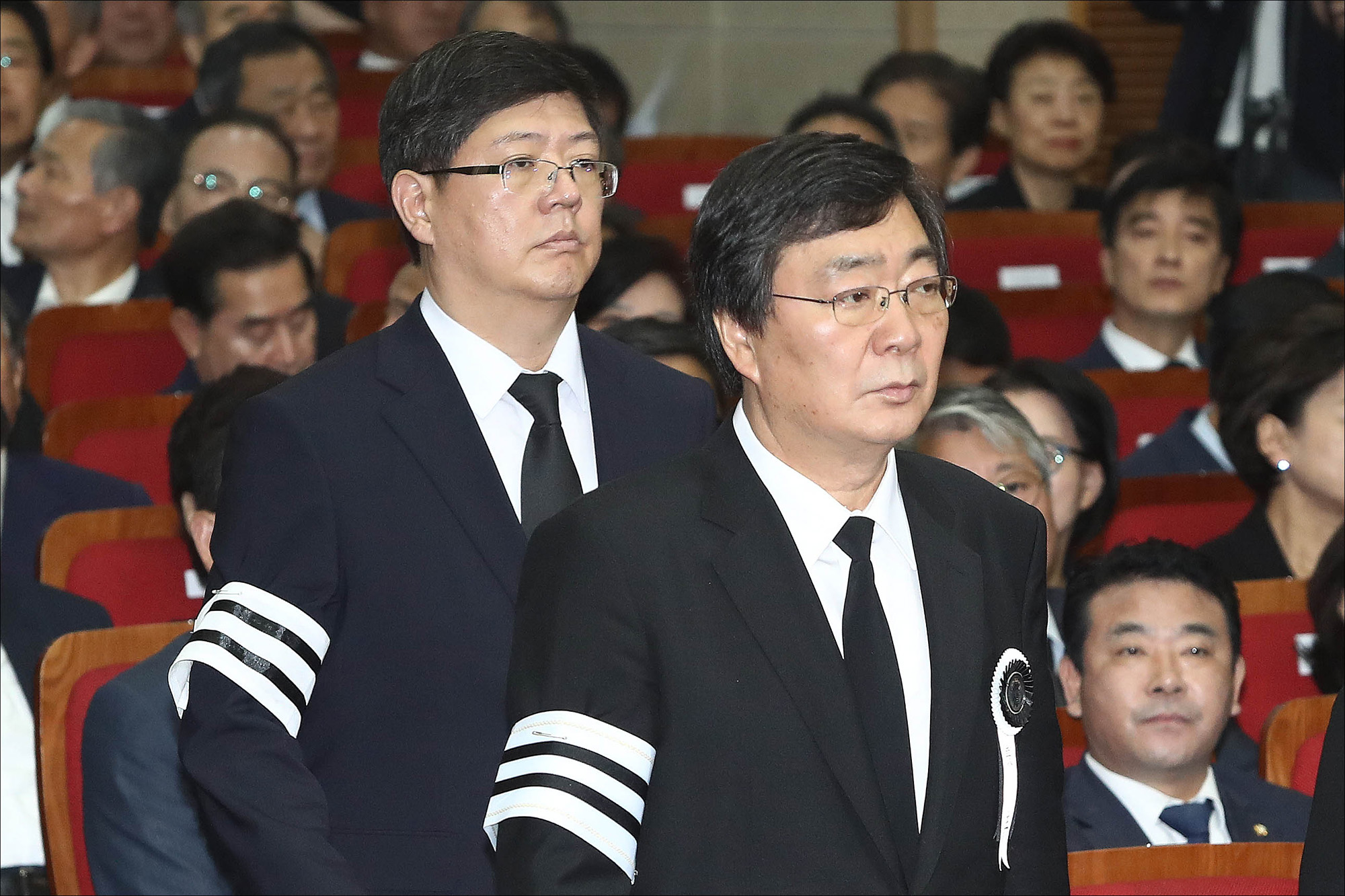 14일 오전 서울 동작구 서울국립현충원 현충관에서 열린 고 이희호 여사 사회장 추모식에서 김홍걸 민화협 대표상임의장과 김홍업 전 의원