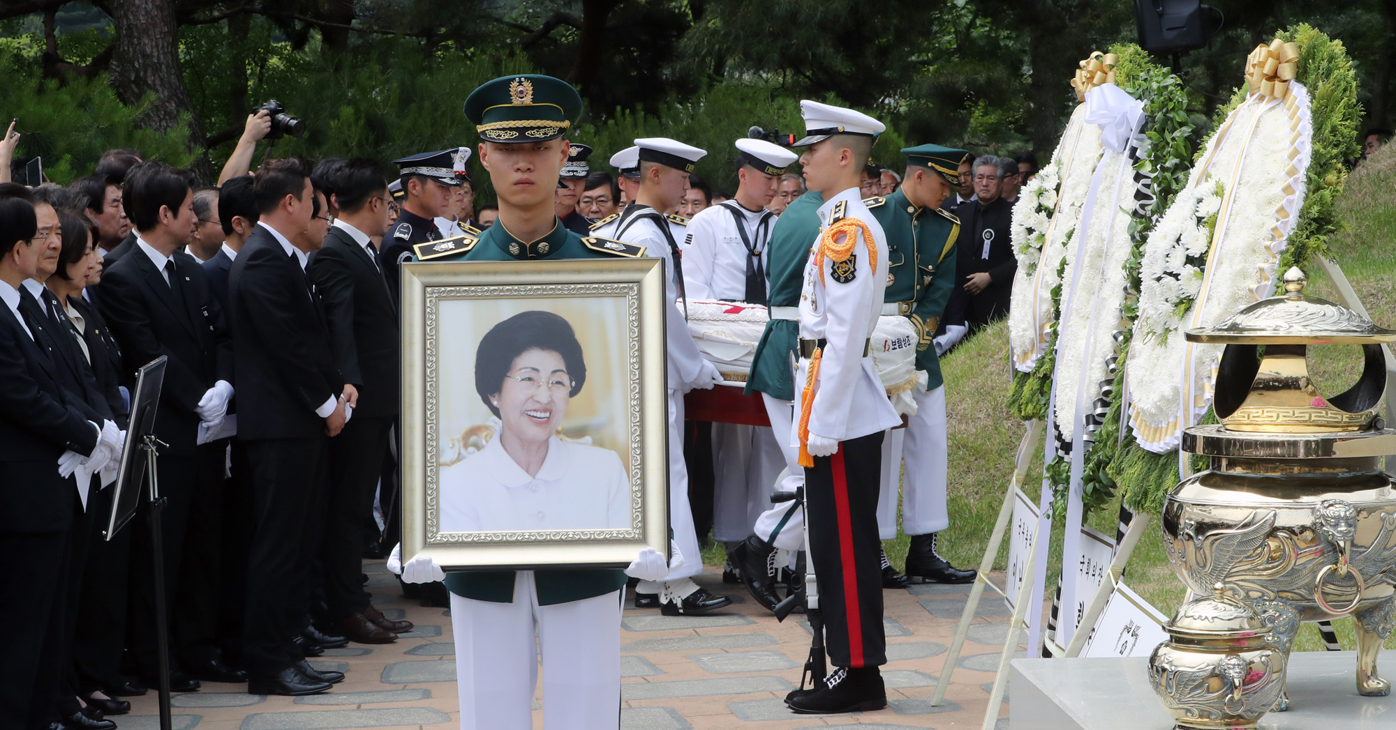 14일 오전 서울시 동작구 국립서울현충원에서 열린 김대중 전 대통령의 부인 고 이희호 여사의 안장식에서 국군 의장대가 고인의 영정을 앞세워 운구하고 있다. 2019.6.14 사진 임준선기자(현장풀)