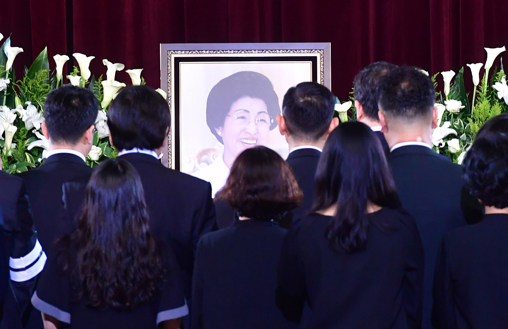 14일 오전 서울 동작구 국립현충원에서 치러진 고 김대중 전 대통령의 부인 이희호 고 이희호 여사의 사회장 추모식에서 차남 김홍업 전 의원, 삼남 김홍걸 민화협 대표상임의장 등 유족들이 헌화 및 분향을 하고 있다.2019.06.14