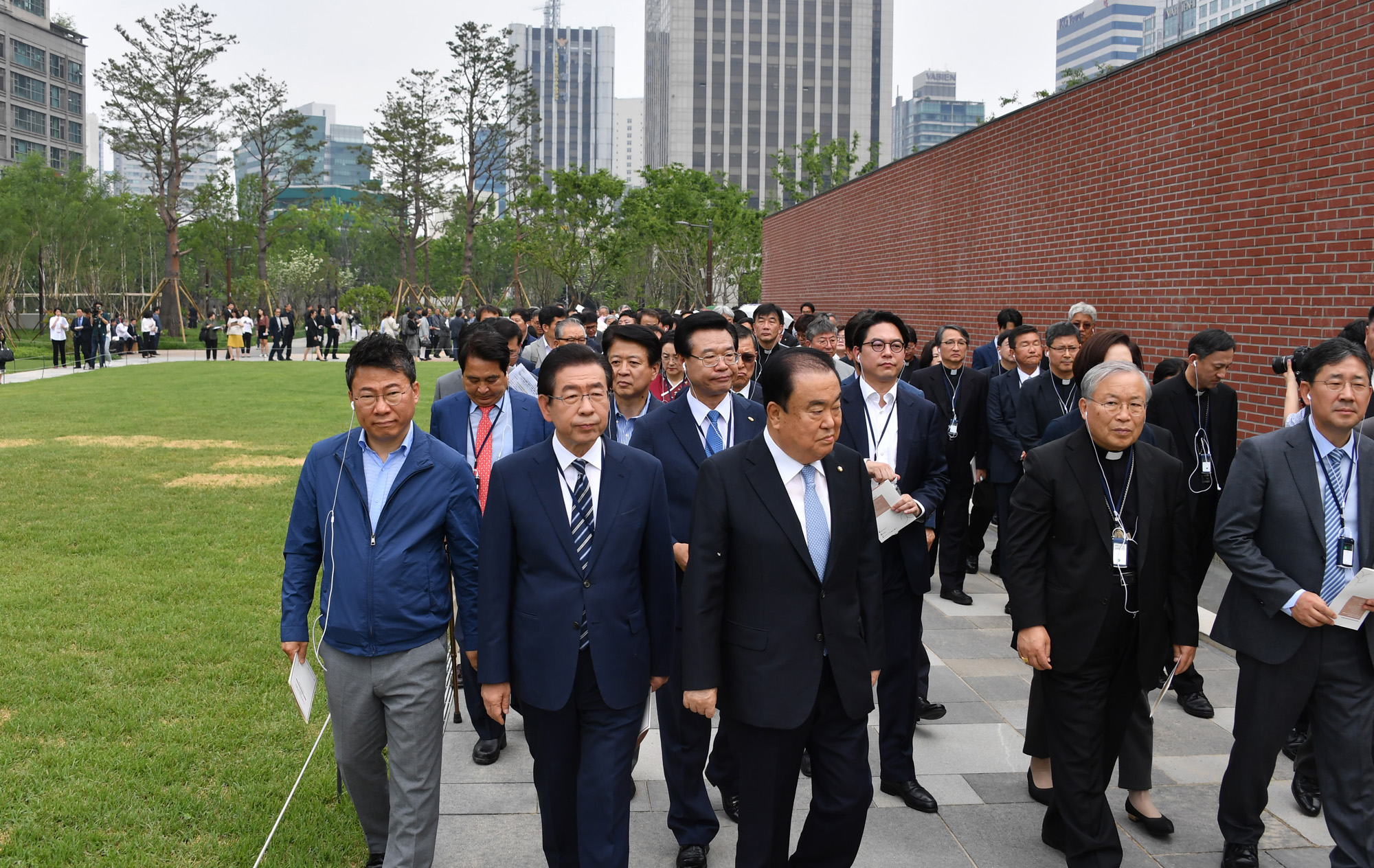 유은혜 사회부총리 겸 교육부장관, 박양우 문화체육관광부 장관, 문희상 국회의장, 박원순 서울시장, 염수정 추기경을 비롯한 내빈들이 25일 서울 중구 서소문성지 역사박물관 개관식에 참석해 역사박물관을 둘러보고 있다. 서울시 제공