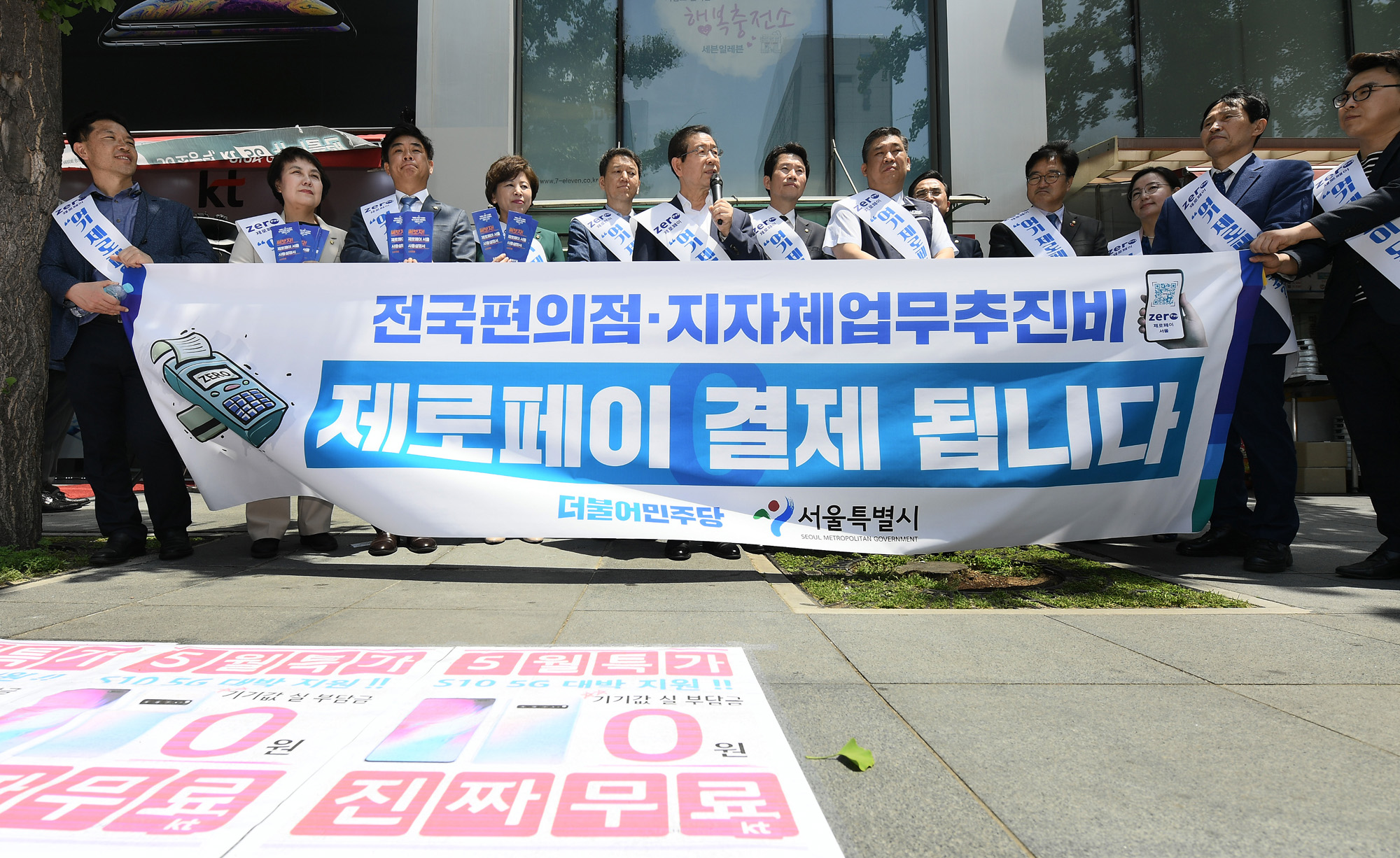 박원순 서울시장과 이인영 더불어민주당 원내대표 등이 29일 오전 서울 여의도 인근에서 소상공인 간편결제 서비스인 제로페이를 시민들에게 알리고 있다. 서울시 제공