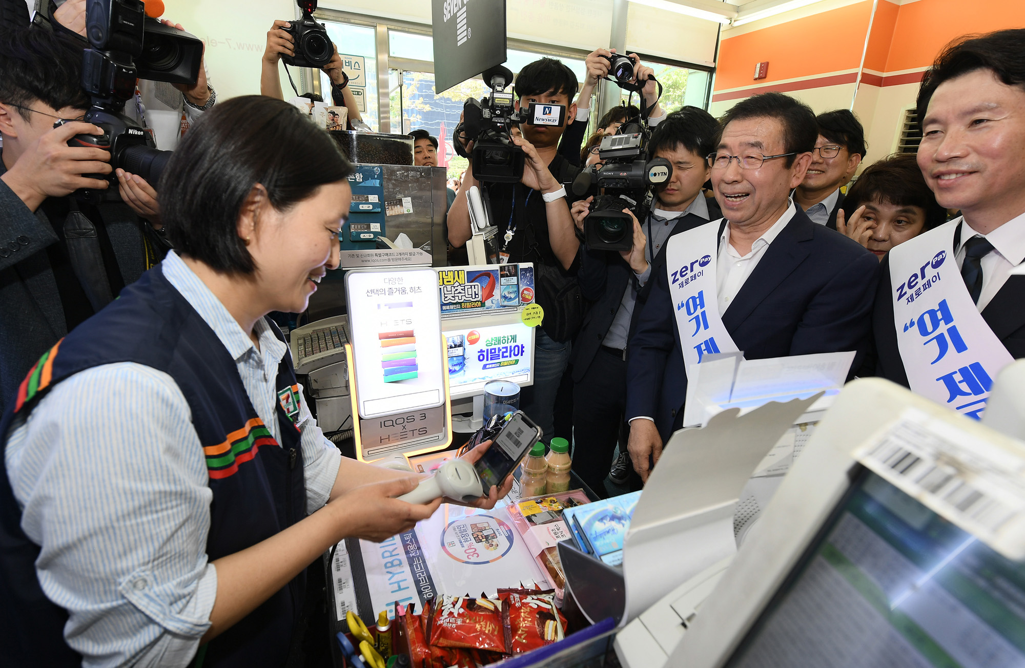 박원순 서울시장과 이인영 더불어민주당 원내대표 등이 29일 오전 서울 여의도 인근에서 소상공인 간편결제 서비스인 제로페이를 시민들에게 알리고 있다. 서울시 제공