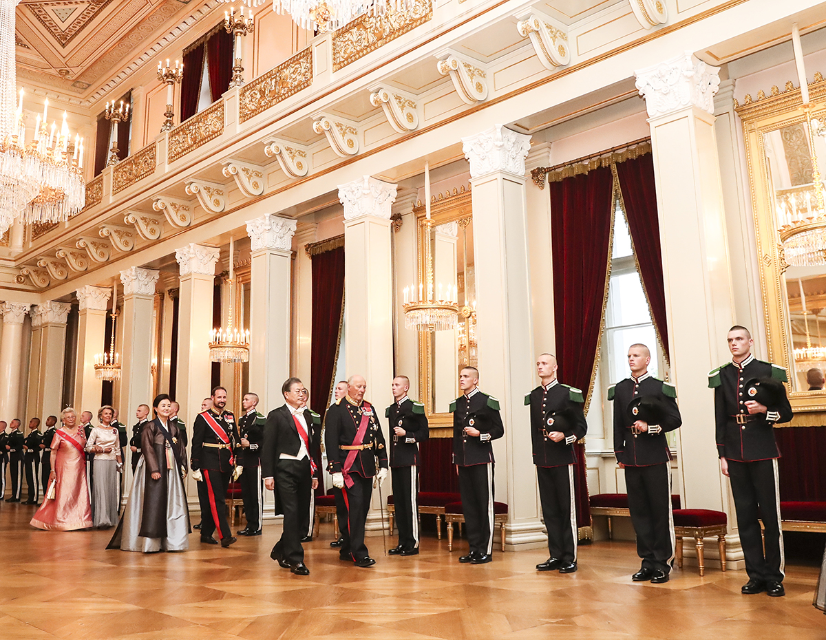 노르웨이를 국빈 방문 중인 문재인 대통령과 김정숙 여사가 12일(현지시각) 오후 오슬로 왕궁에서 열린 국빈만찬에 참석하고 있다. 2019.06.12 사진 청와대제공