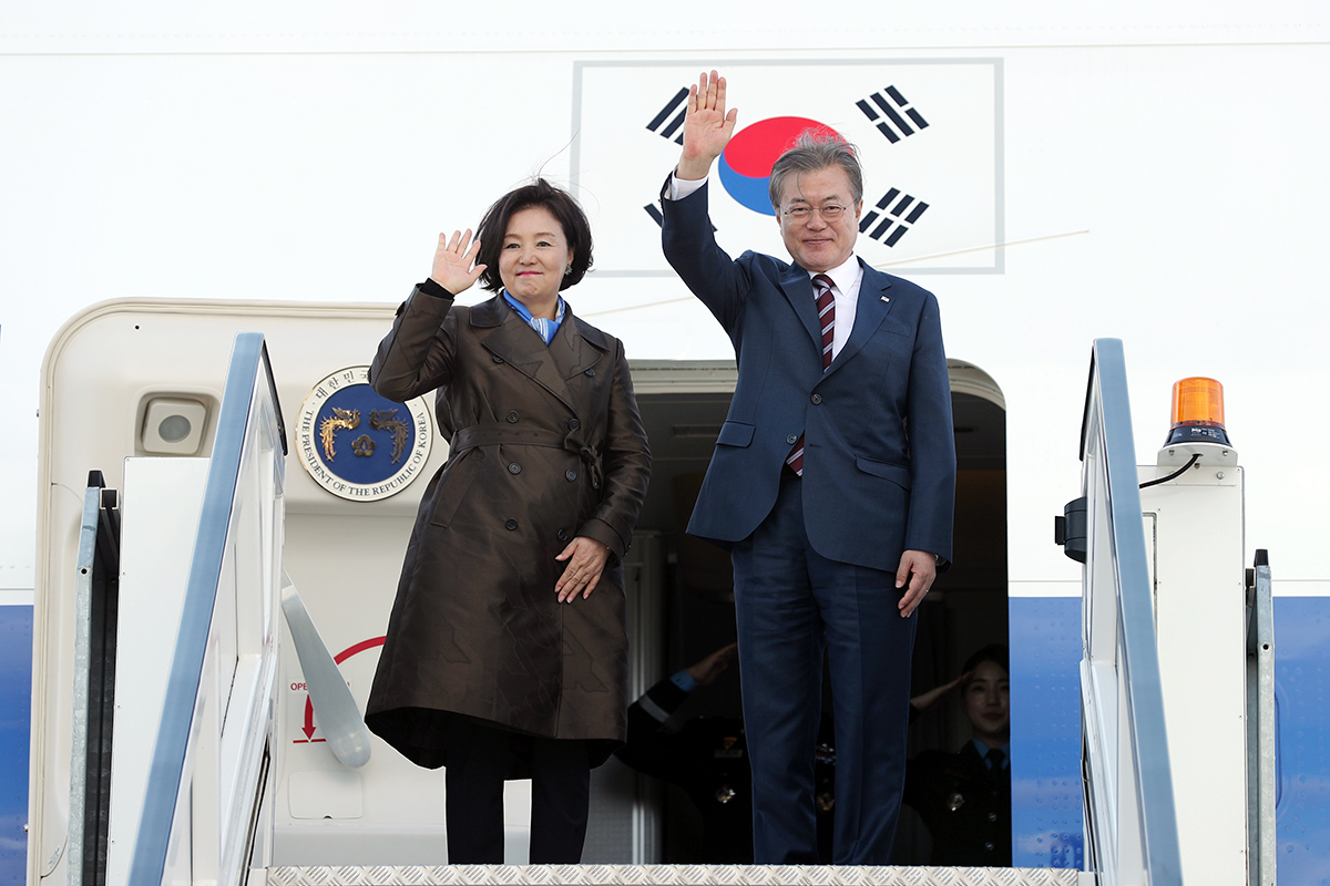 노르웨이 국빈방문 일정을 마친 문재인 대통령과 김정숙 여사가 13일 오후 노르웨이 베르겐 플레스란 공항에서 떠나기 전 손을 흔들고 있다. 2019.6.13