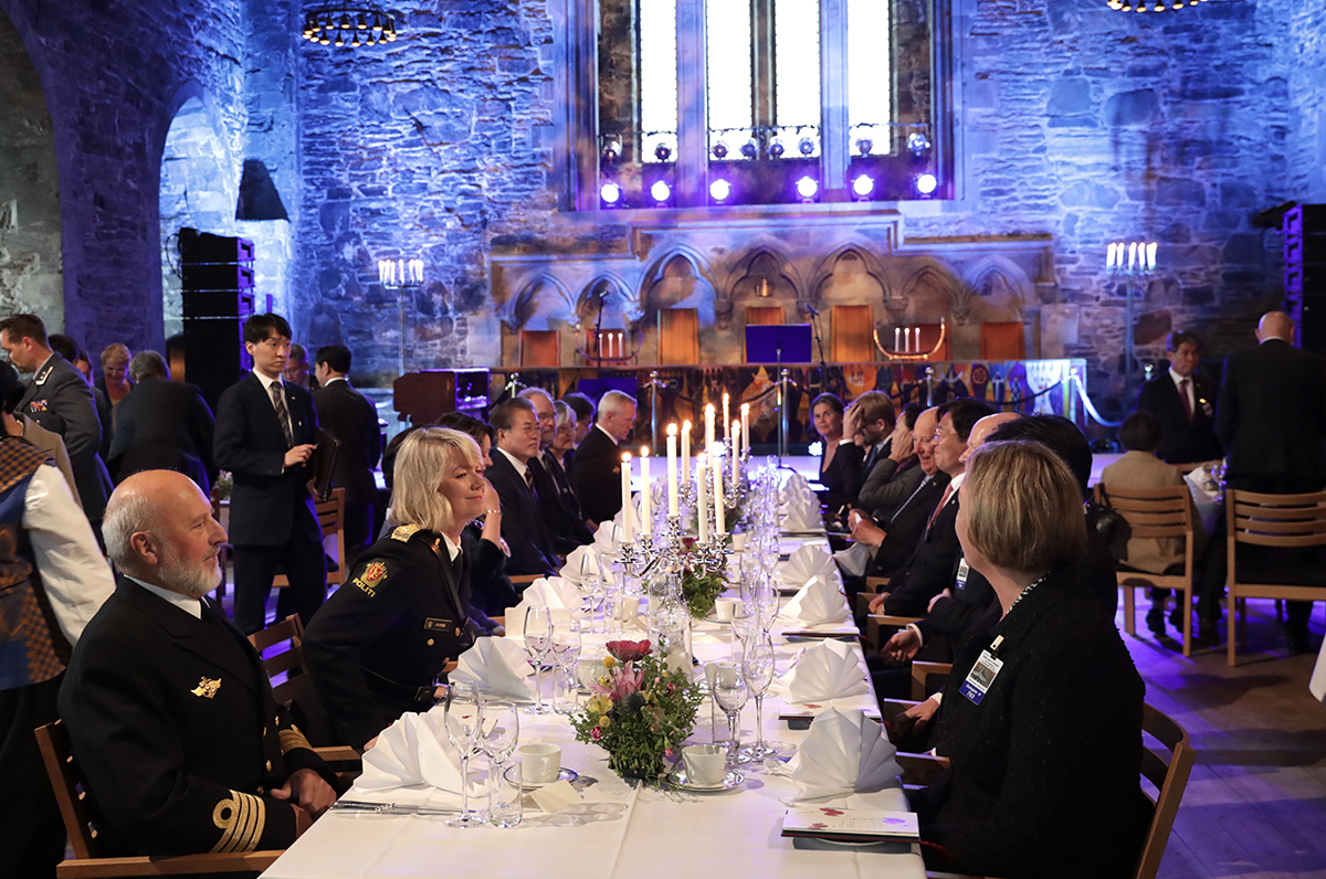 문재인 대통령이 13일 오후(현지시간) 노르웨이 베르겐 루슨크란츠토넷 호콘홀에서 마르테유스 페르센 베르겐 시장 주최로 열린 오찬에 참석해 있다.