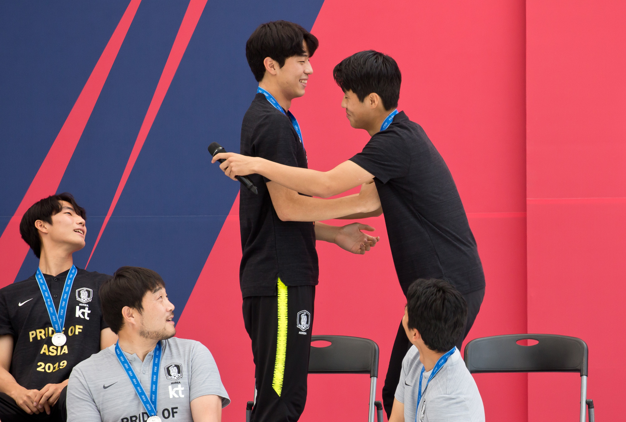 [eoimage=서울] 임준선 기자 =국제축구연맹(FIFA) U-20 월드컵 준우승을 거둔 대한민국 축구대표팀 김현우(오른쪽)가 17일 오후 서울 중구 서울광장에서 열린 공식 환영식에서 지난 경기에 심판에게 했던 행동을 재현하고 있다. 2019. 6.17 eomaster@eoimage.com