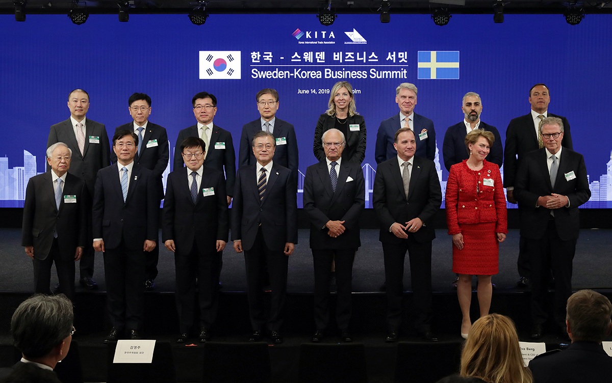 14일 오후(현지시간) 스웨덴 스톡홀름 앳 식스 호텔에서 열린 한-스웨덴 비즈니스 서밋에서 문재인 대통령과 칼 구스타프 16세 국왕, 스테판 뢰벤 스웨덴 총리를 비롯한 참석자들이 기념촬영을 하고 있다. 2019.6.14 사진 청와대제공
