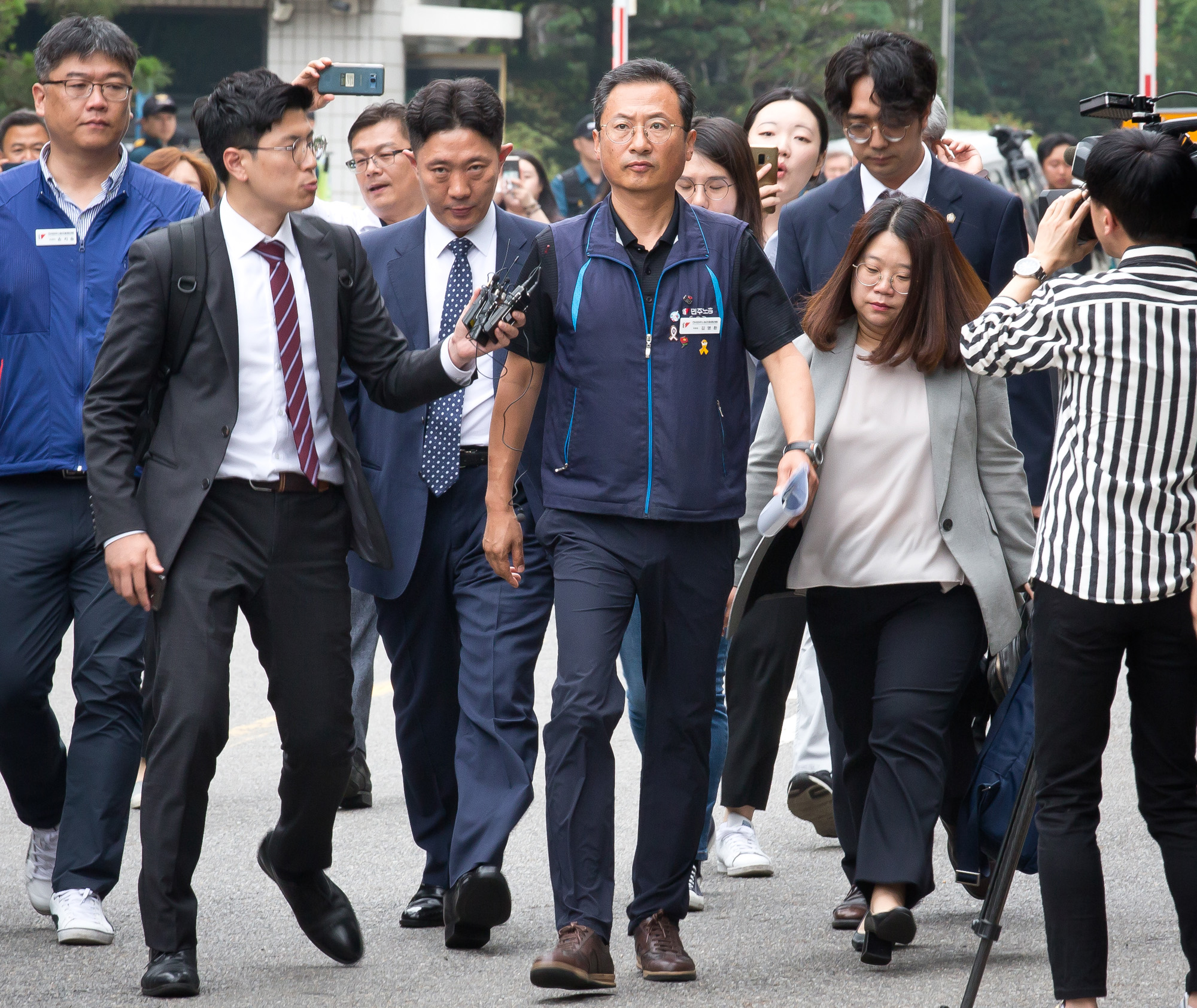 [eoimage=서울] 임준선 기자 = 국회 앞에서 경찰과 충돌을 빚는 불법 집회를 주최한 혐의를 받는 김명환 민주노총 위원장(54)이 구속 전 피의자 심문(영장실질심사)을 받기 위해 서울남부지법에 출석 하고 있다. 2019. 6.21 eomaster@eoimage.com