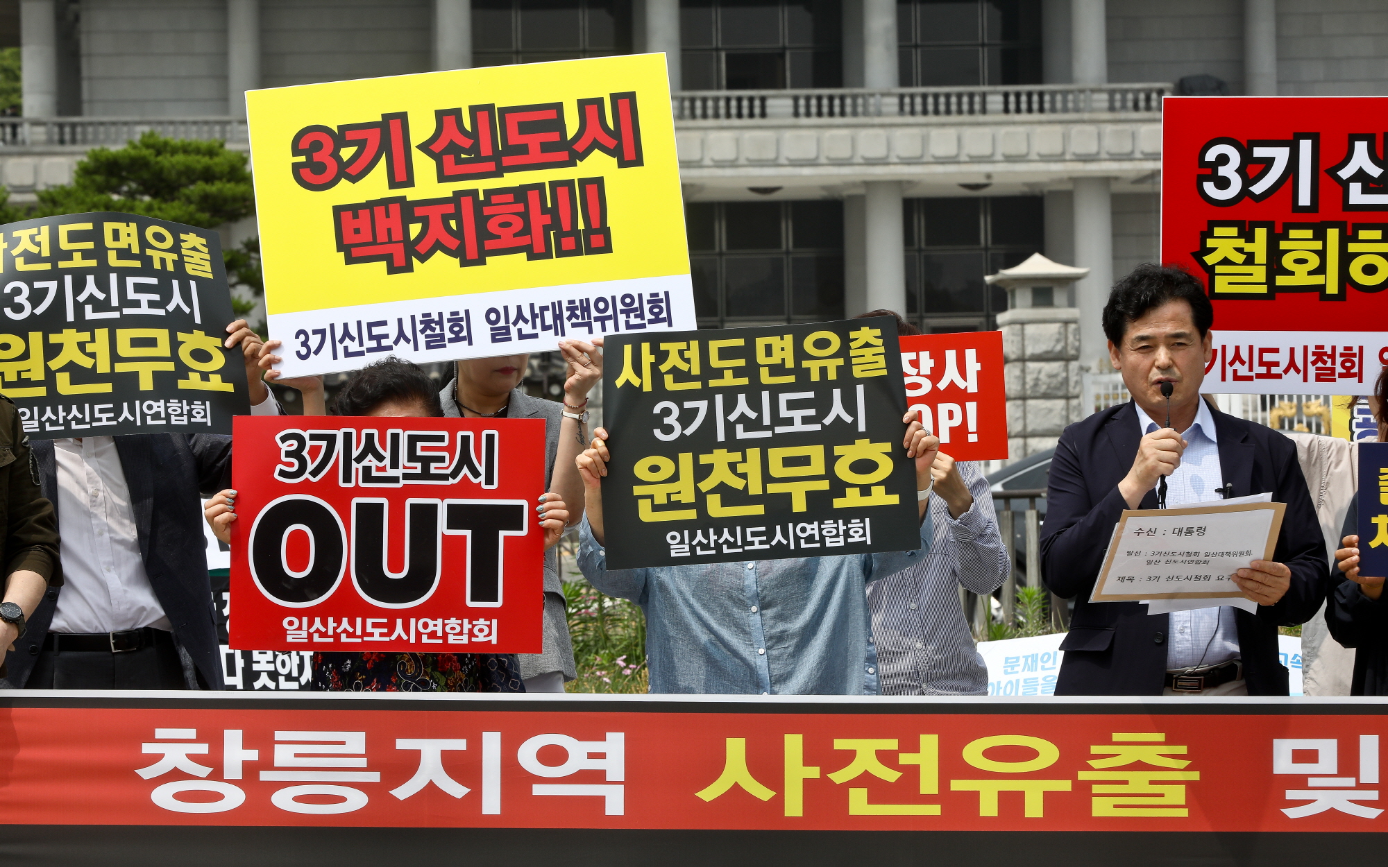 [서울=eoimage] 고성준 기자 = 3기 신도시 철회 일산대책위원회 회원들이 21일 오후 서울 청와대 분수대 앞에서 3기 신도시 전면 철회 촉구 기자회견을 하고 있다. 2019.6.21